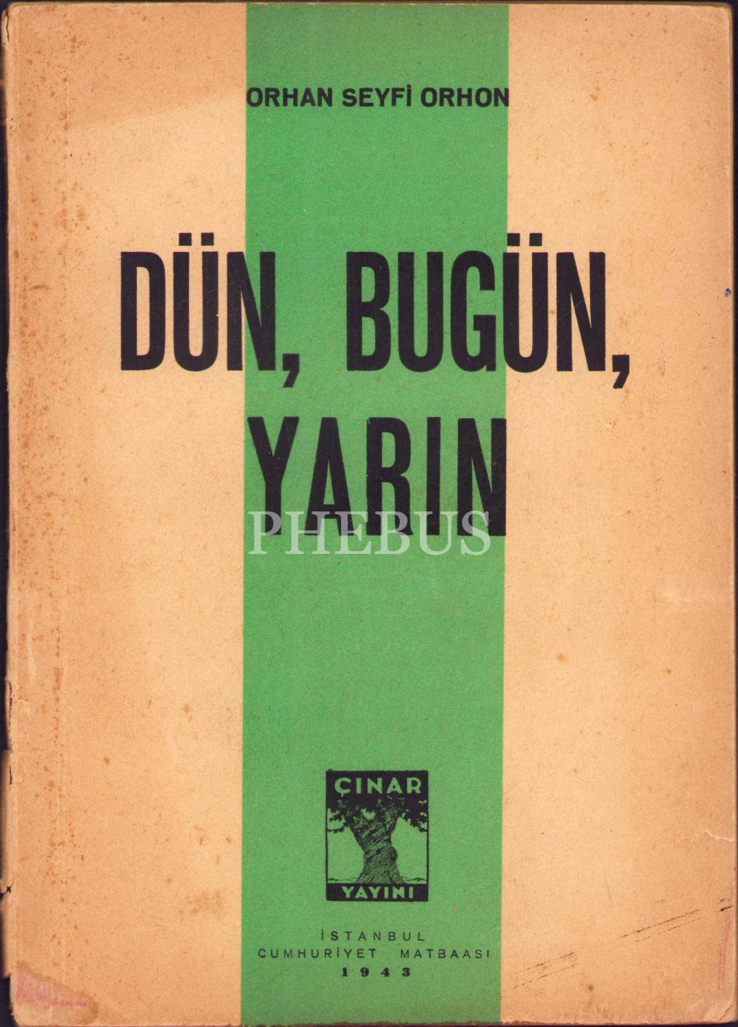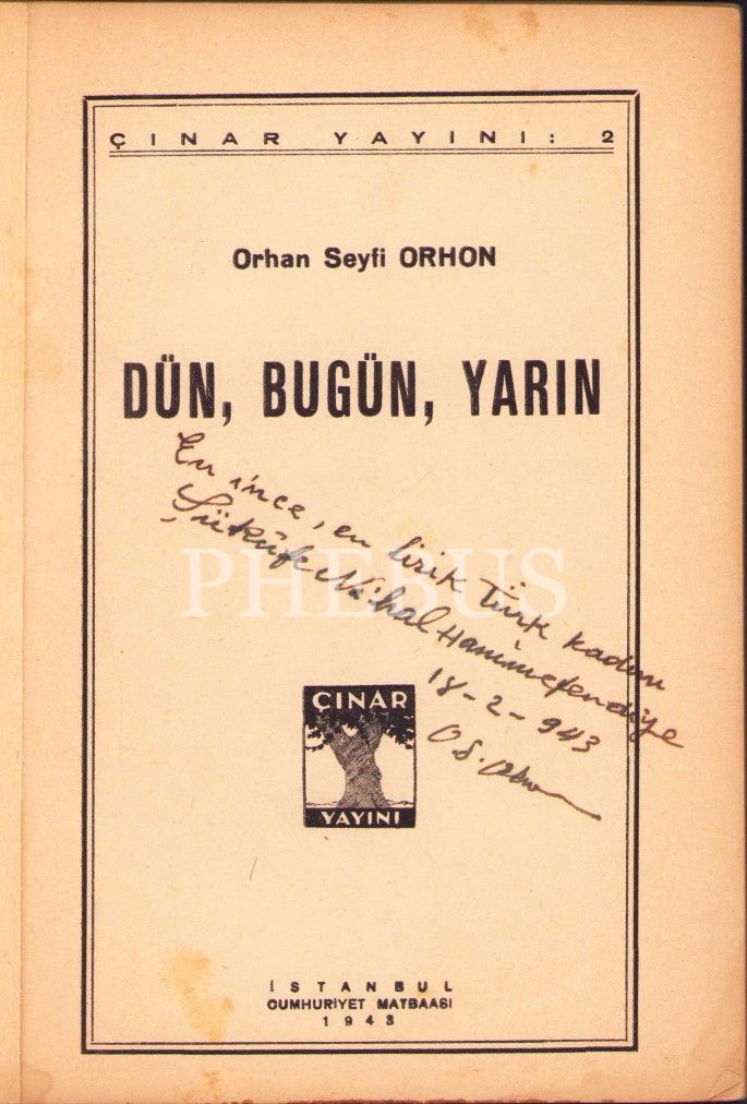 Orhan Seyfi Orhon'dan Yazar Şukûfe Nihal Başar'a İthaflı ve İmzalı "Dün, Bugün, Yarın", Çınar Yayınları 1943, 77 sayfa, kitap sırtı yıpranmış haliyle, 14x20 cm