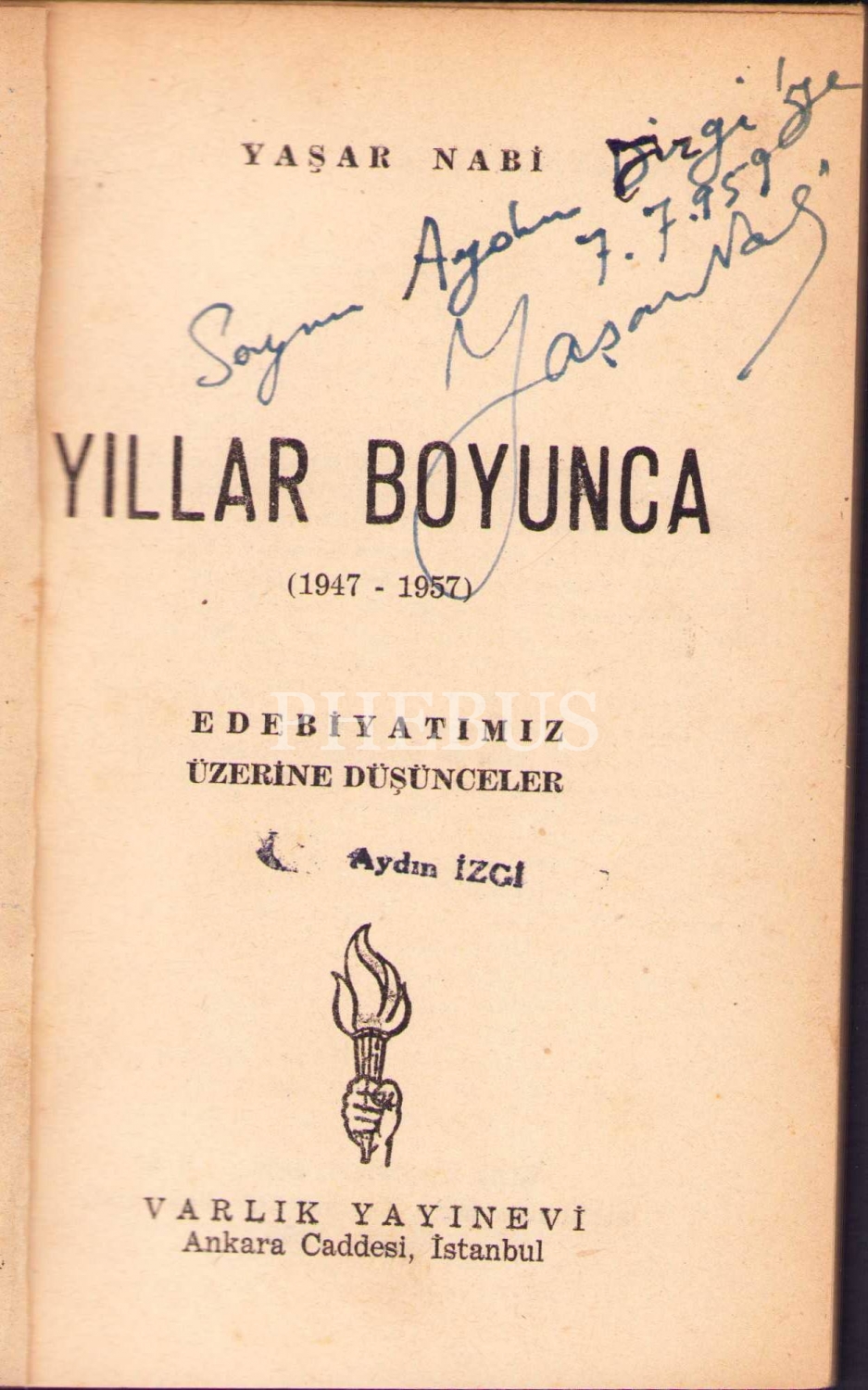 İthaf, "Sayın Aydın Dizgi'ye 7.7.959" şeklindedir.