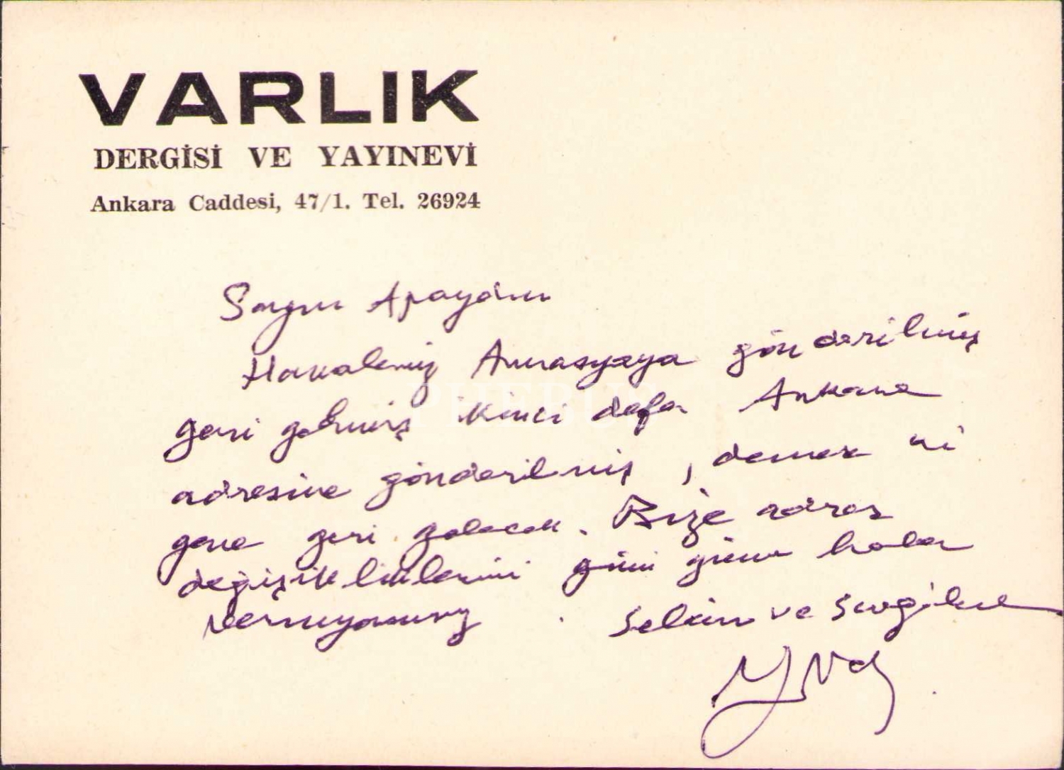 Varlık Dergisi Antetli Kağıda Yaşar Nabi Tarafından Yazılan Mektup, 9x13 cm