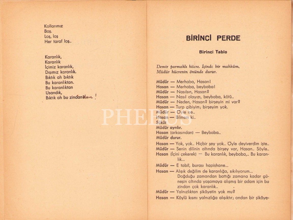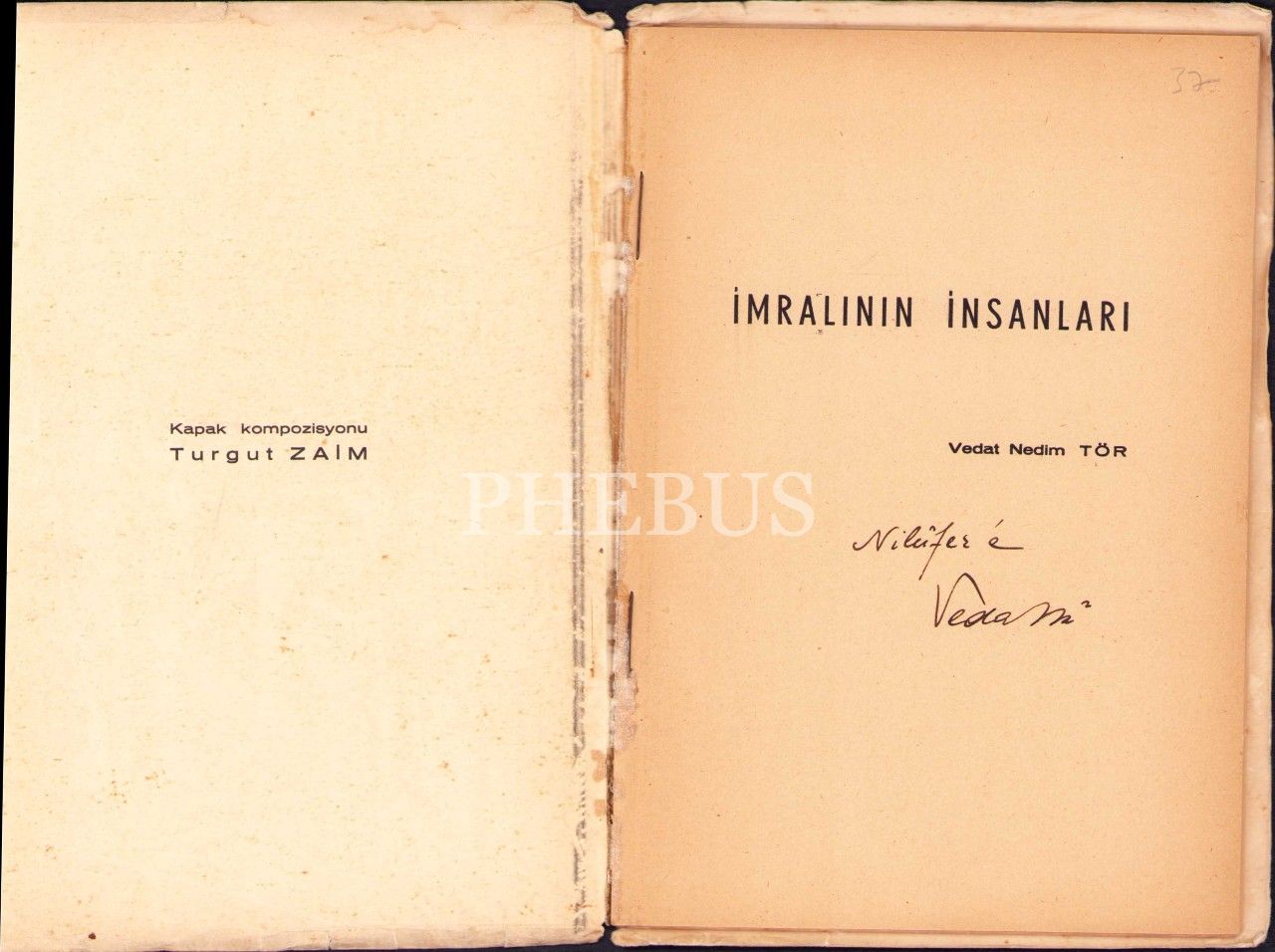 Vedat Nedim Tör'den İthaflı ve İmzalı "İmralının İnsanları" Başlıklı Tiyatro Oyunu, Zerbamat Basımevi, 53 sayfa, kapağı yıpranmış haliyle, 14x20 cm