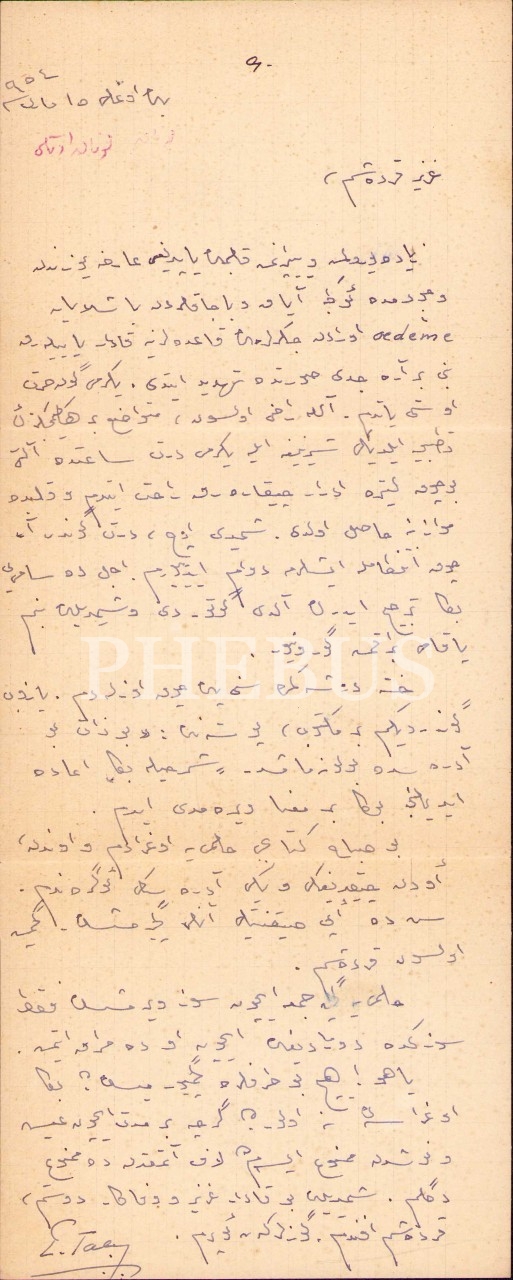 Yazar Ercüment Ekrem Talu'nun Kendi Elyazısıyla Osmanlıca Mektup, 1954 tarihli, "E. Talu" şeklinde imzalı, 11x29 cm