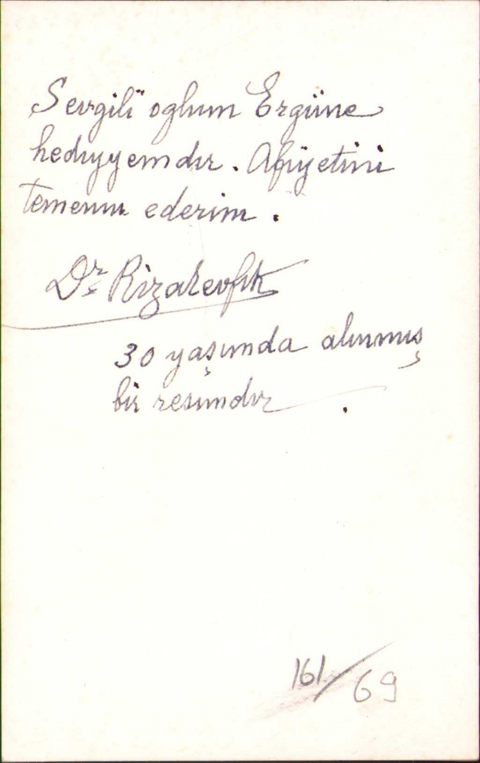 Fotoğrafın arkasında "Sevgili oğlum Ergüne hediyemdir. Afiyetini temenni ederim. Dr. Rıza Tevfik, 30 yaşımda alınmış bir resimdir" şeklinde not düşülmüştür.