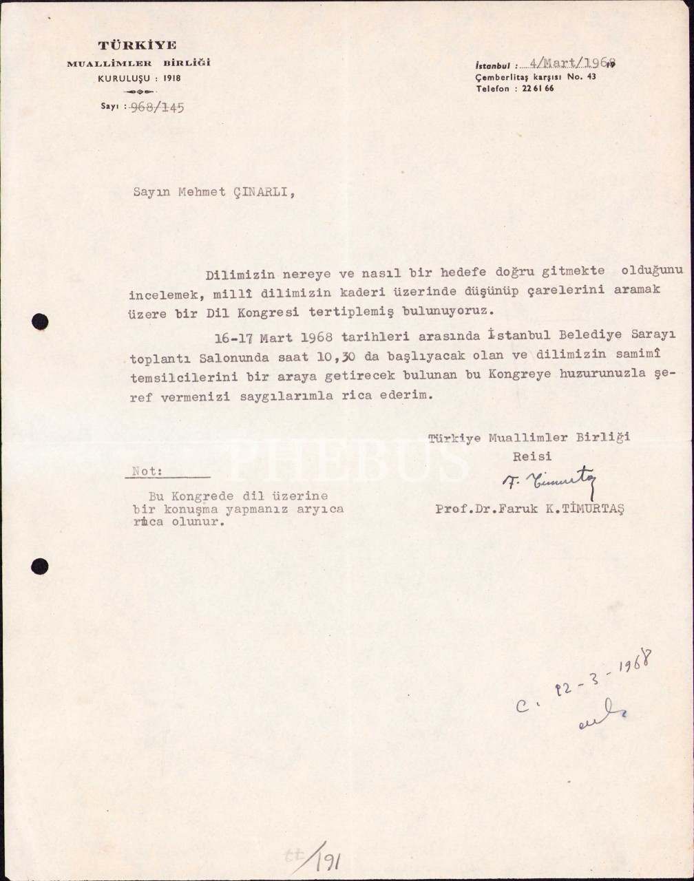 Birinci Mektup Faruk Timurtaş'ın Mehmet Çınarlı'ya yazdığı ve dil üzerine konuşmacı olarak çağırdığı mektuptur. Tarih: 4 Mart 1968, ölçüsü 19x23 cm. İkinci Mektup dil kongresinin tarihinin ertelenmesi hakkındadır. Tarih: 7 Mart 1968, ölçüsü 14x23 cm.
