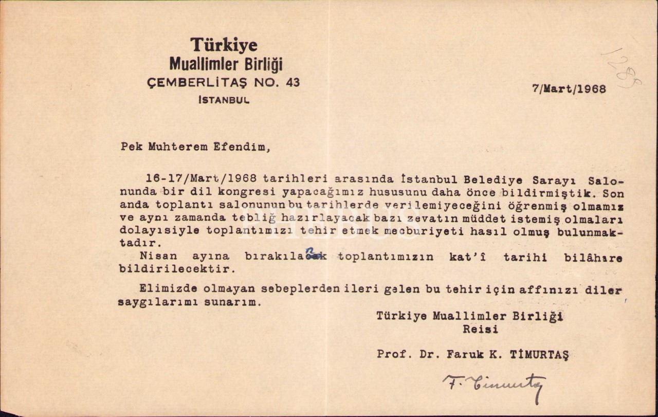 Edebiyatçı Faruk Kadri Timurtaş'ın Türkiye Muallimler Birliği'ne yazdığı 2 adet Dil Kongresi mektubu