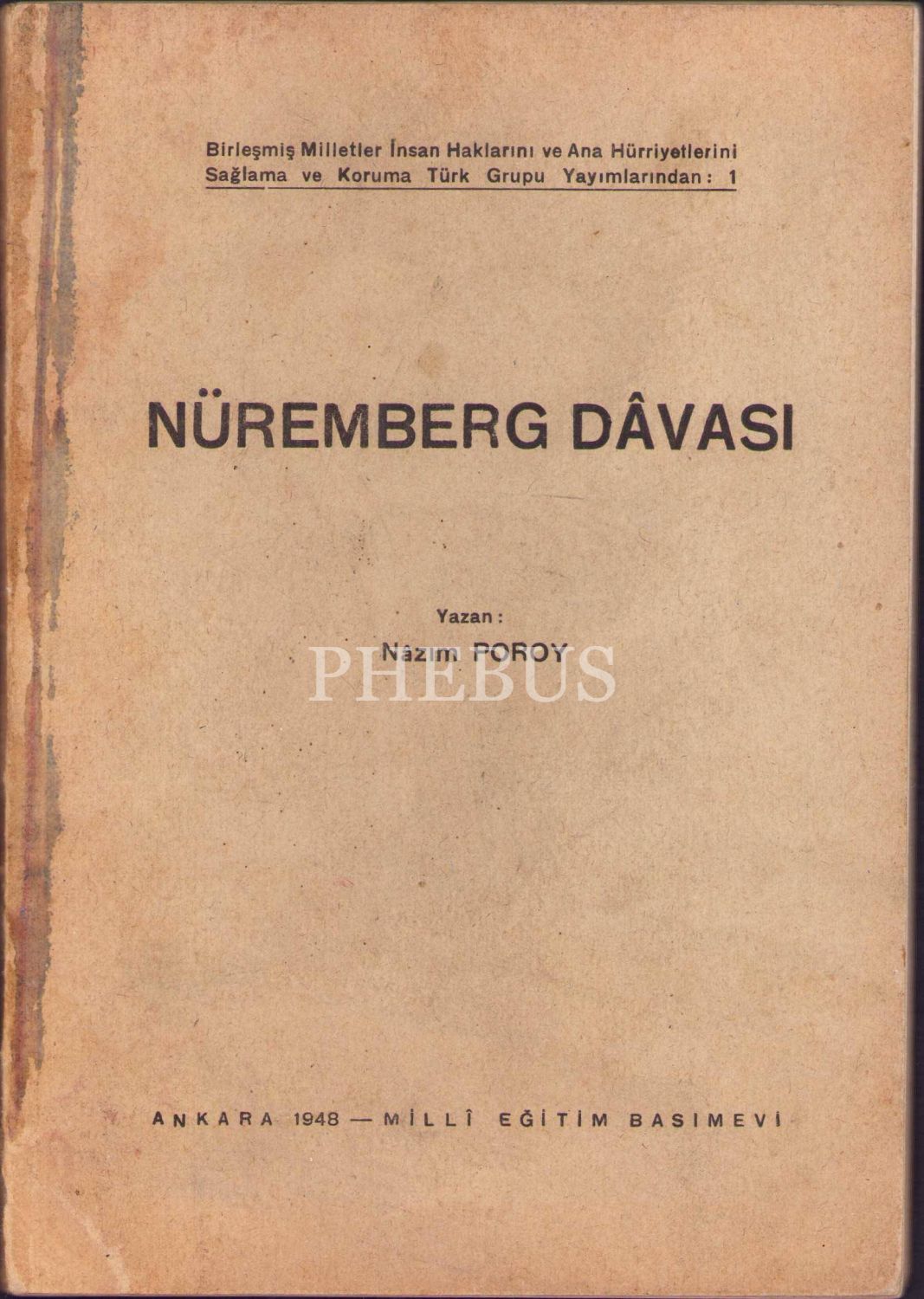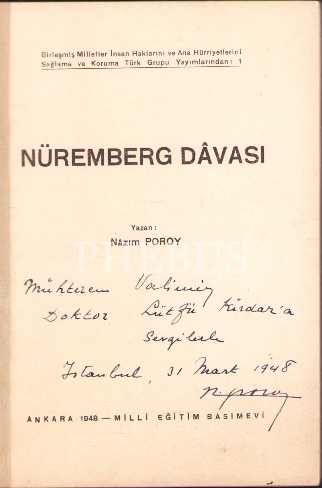 Siyasetçi Nâzım Poroy'dan Lütfü Kırdar'a İthaflı ve İmzalı "Nüremberg Dâvası", Ankara milli Eğitim Basımevi 1948, 99 sayfa, kapağı yorgun haliyle, 14x20 cm