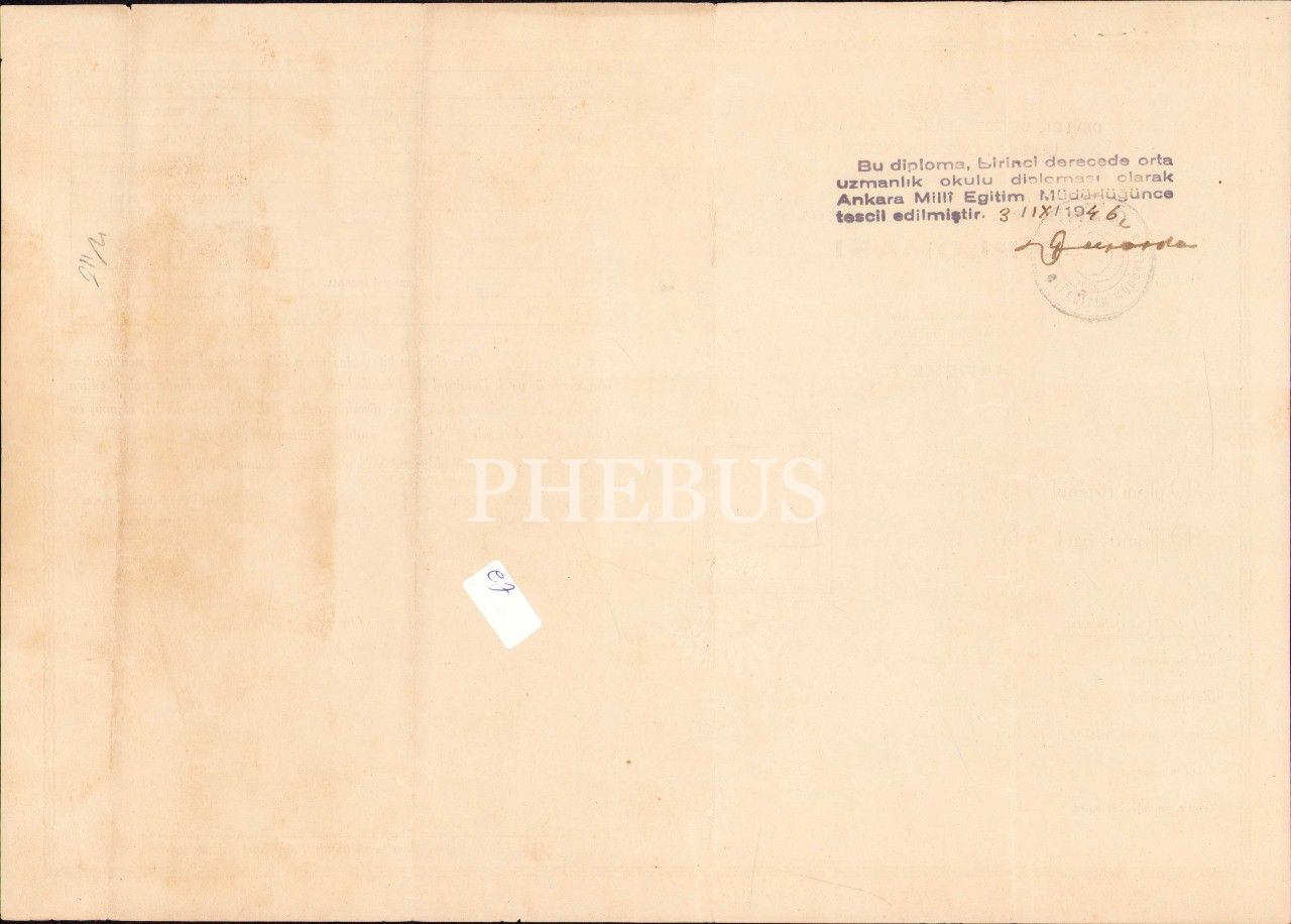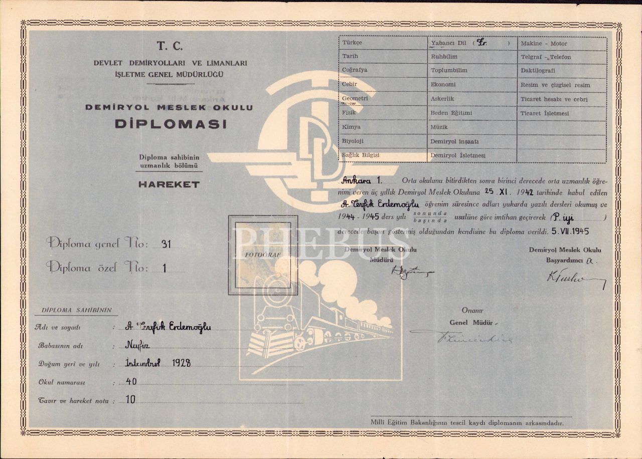 TCDD Demiryol Meslek Okulu diploması, 1945 tarihli, 24x34 cm