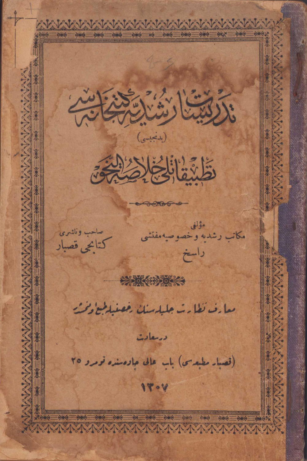 Tedrisatı Rüştüye Kütüphanesi Tatbikatlı Hülasatül'nahv, Mektebi rüştiye ve hususiye müfettişi Rasih, Kasbar Matbaası,1891 tarihli, Osmanlıca, 79 sayfa, haliyle, 14 x 20 cm , haliyle