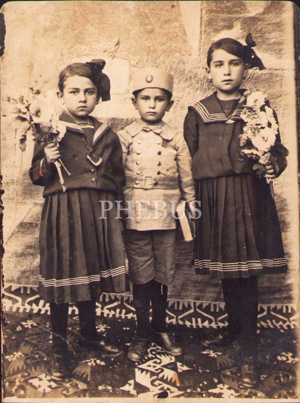 Elinde kitabı ve asker üniformasıyla poz veren erkek çocuğu ile bahriye üniformalı kız çocukları, kırık haliyle