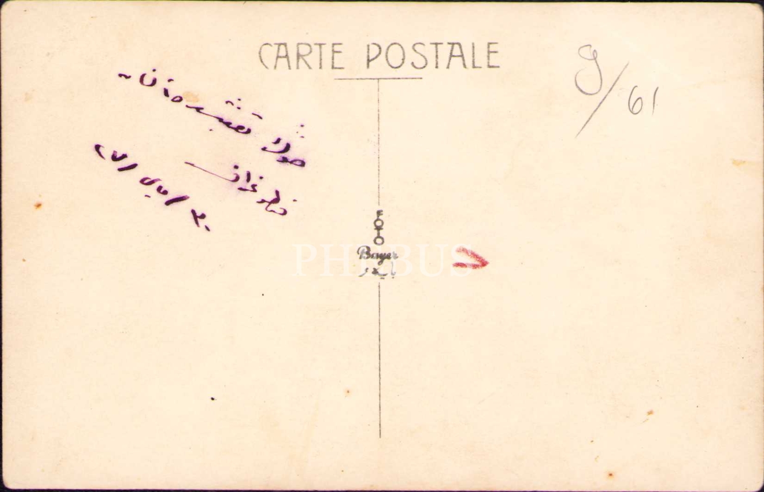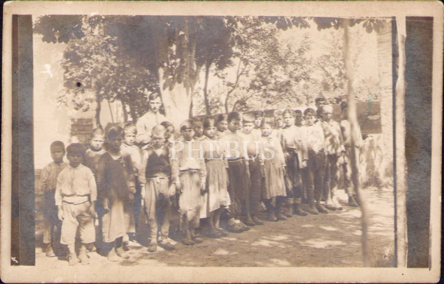 Çocuklar ve öğretmenlerinin hatıra fotoğrafı, arkası Osmanlıca yazılı, 1327 tarihli, üst ve alt köşesi kırık haliyle