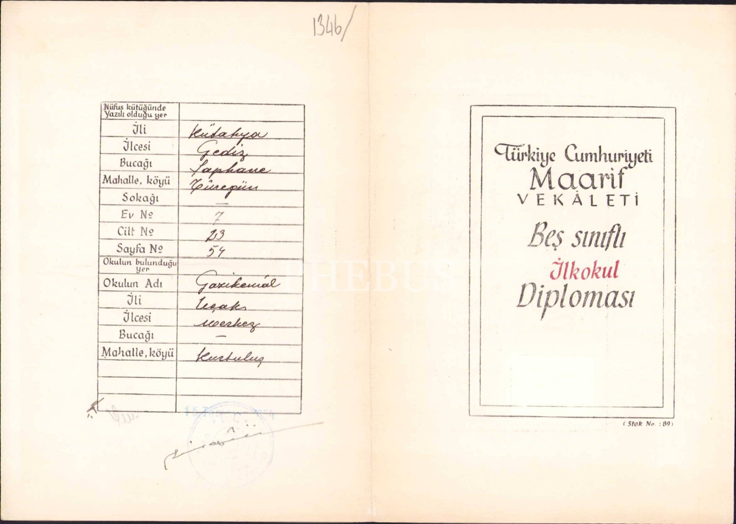 Fotoğraflı ilkokul diploması, 1954 tarihli, 21x29 cm