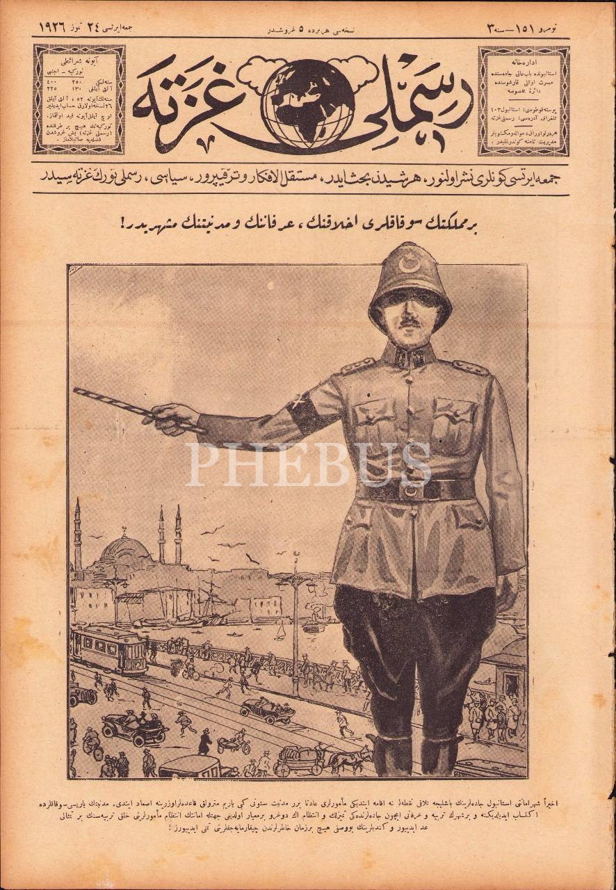 Osmanlıca Resimli Gazete 151. sayı, 24 Temmuz 1926, "Bir Memleketin Sokakları Ahlakının, İrfanının ve Medeniyetinin Göstergesidir!" başlıklı ön kapak görseliyle, 27x39 cm, lekeli ve bir kenarı yıpranmış haliyle