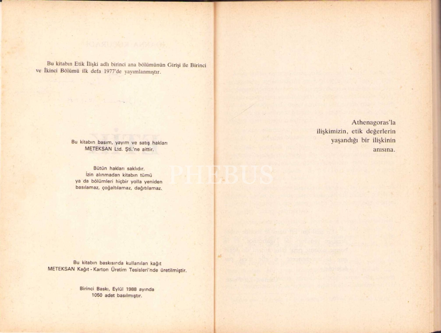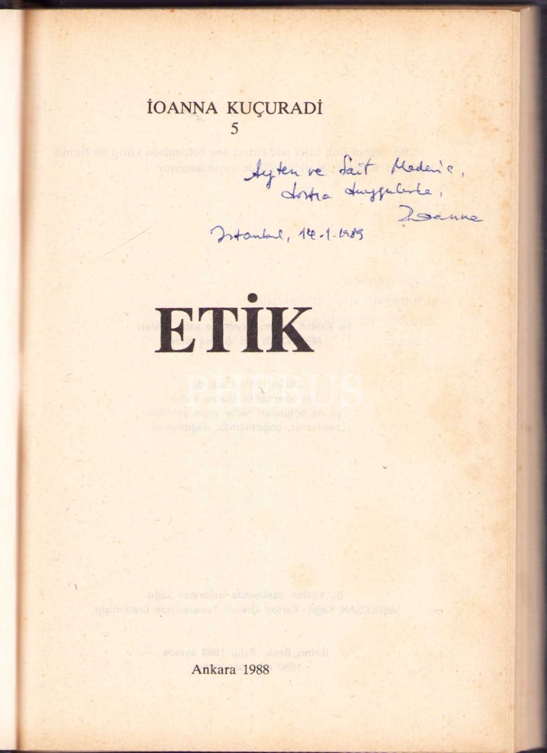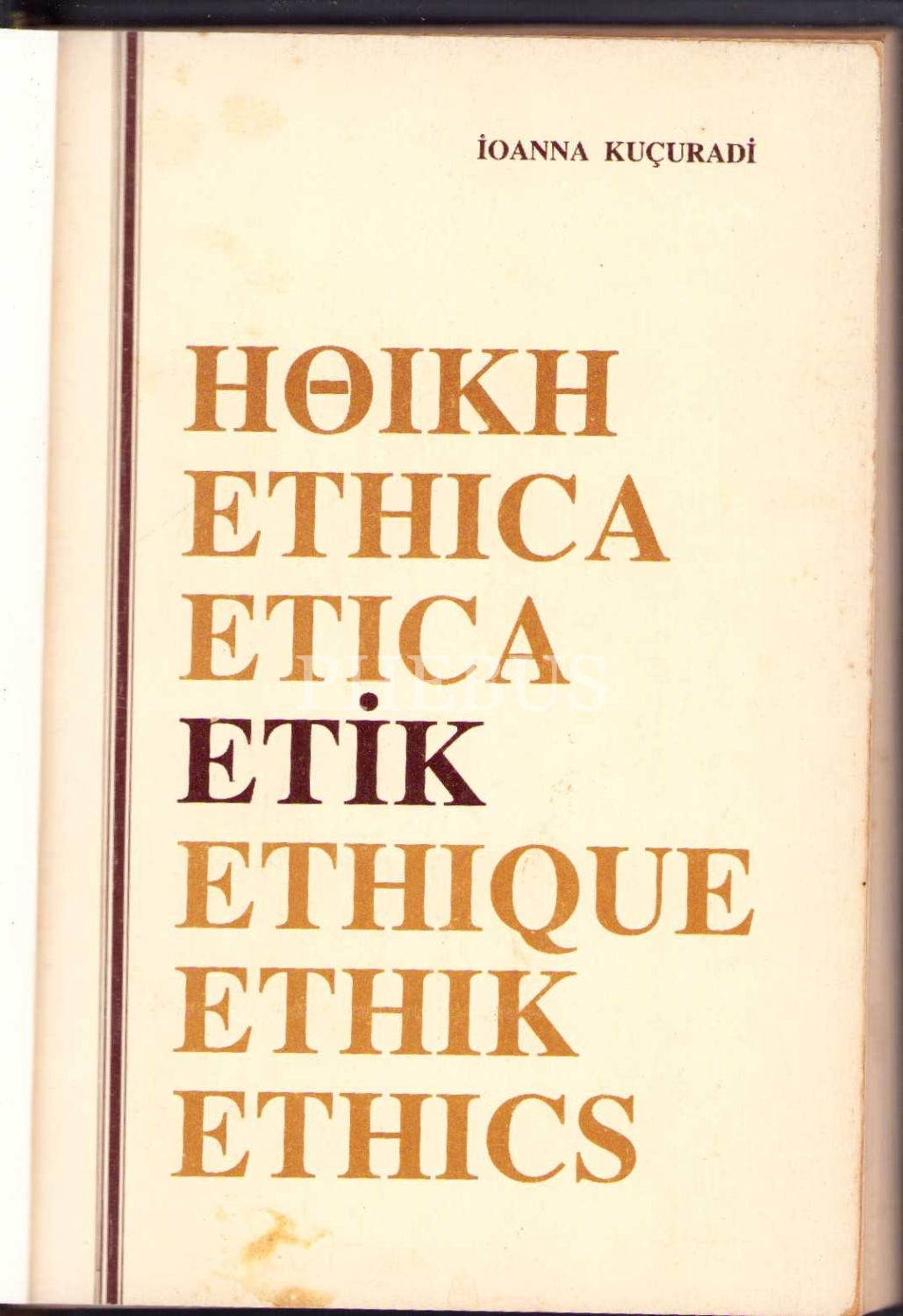 Etik, İoanna Kuçuradi, yazarından ithaflı ve imzalı, Meteksan Ltd. Şti., Ankara 1988, 194 s., 14x20 cm