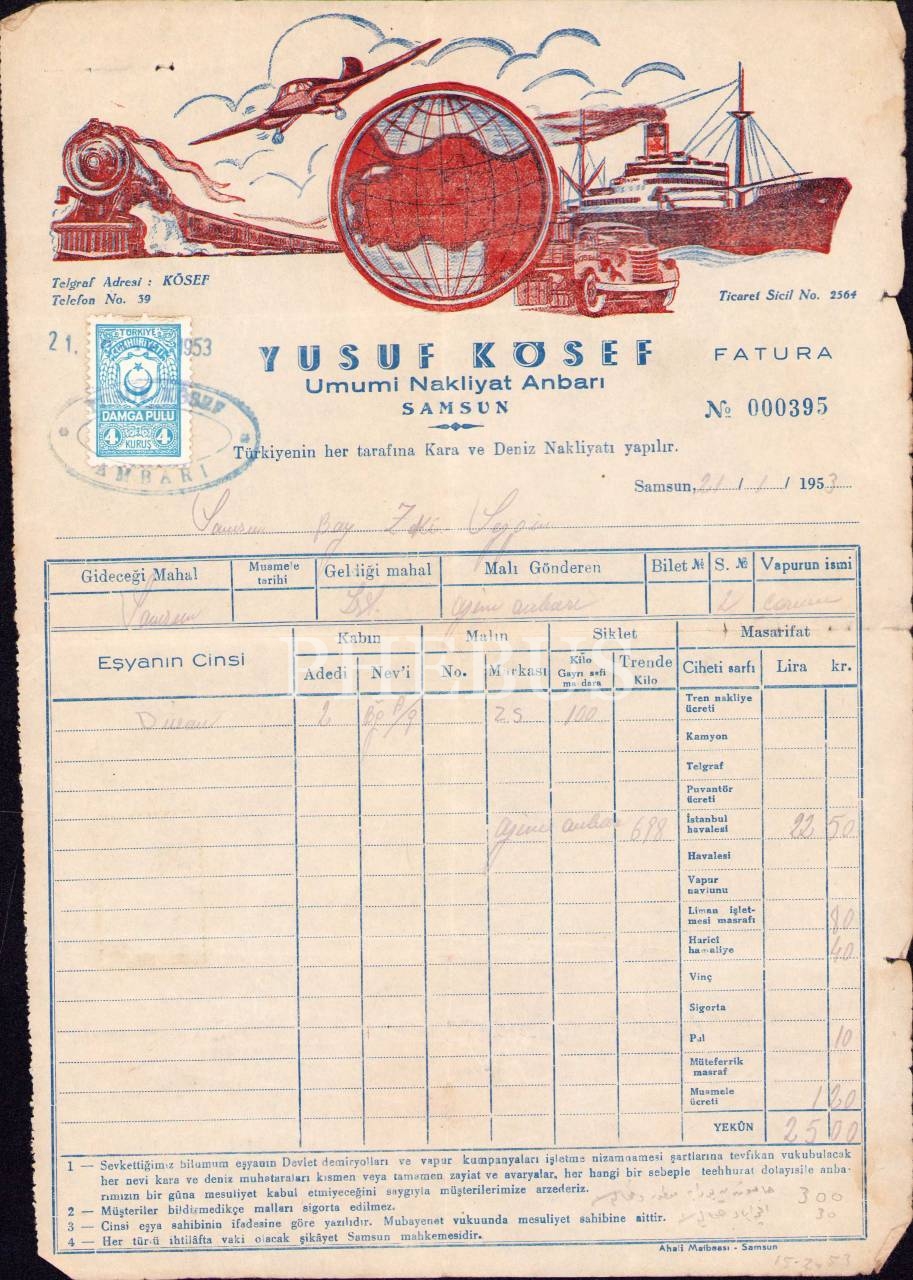 Yusuf Kösef Umumi Nakliyat Anbarı-Samsun antetli fatura, 1953 tarihli, 20x28 cm, hafif yıpranmış haliyle