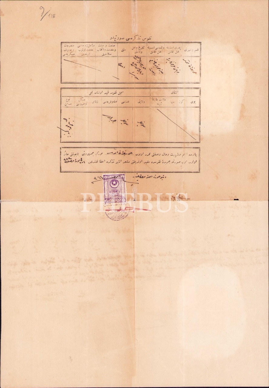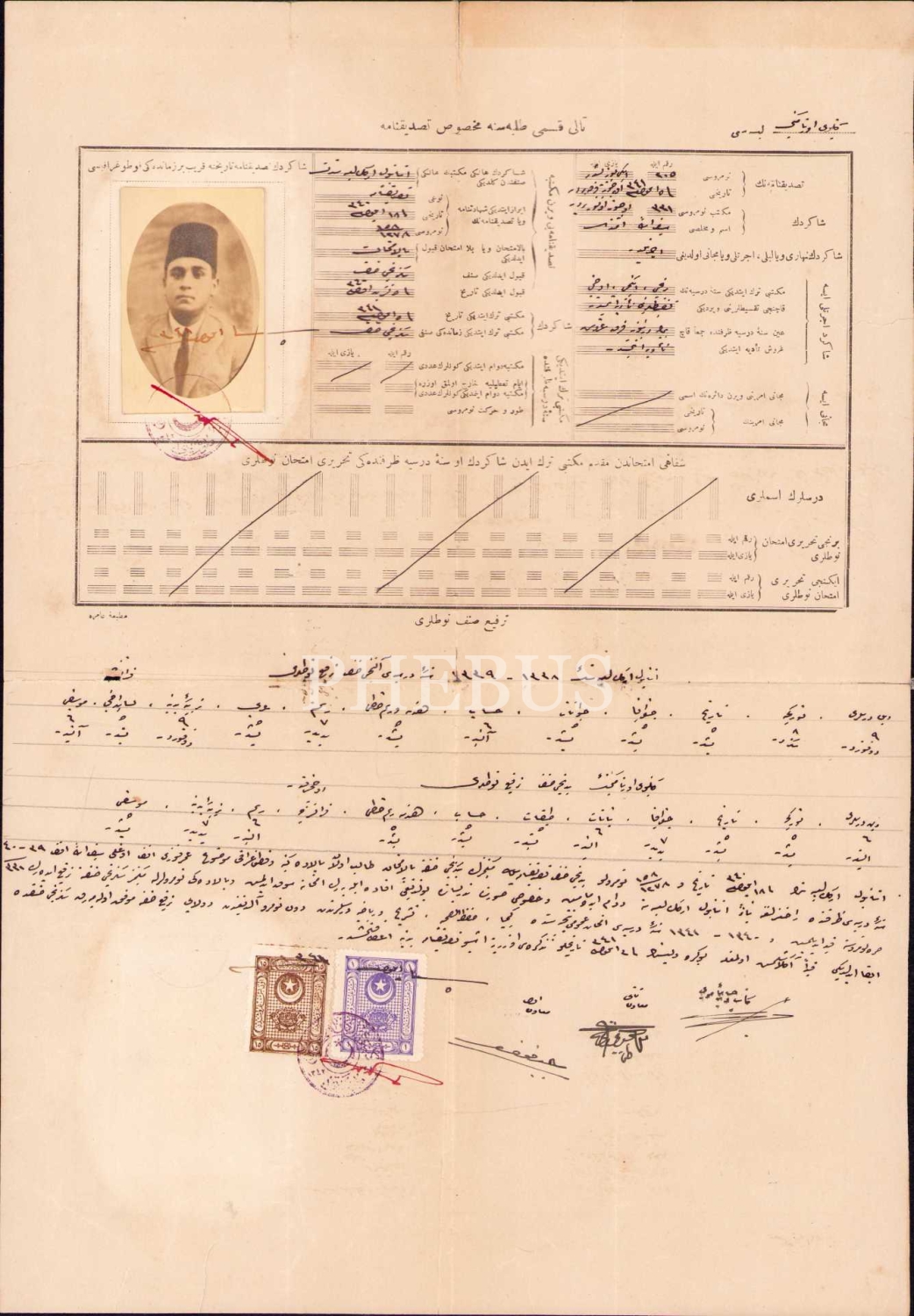 1341 tarihli Osmanlıca fotoğraflı tasdikname, 28x40 cm, kenarları yırtık haliyle