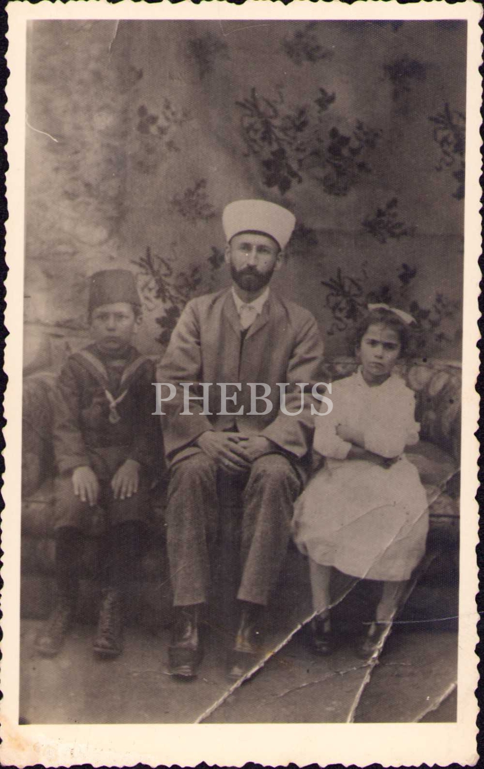 Sarıklı beyefendi ve iki çocuğun hatıra fotoğrafı, arkası yazılı