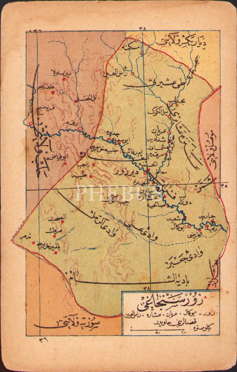 Kart formunda Osmanlıca Zor [Deyrizor] Sancağı haritası, hafif yıpranmış haliyle