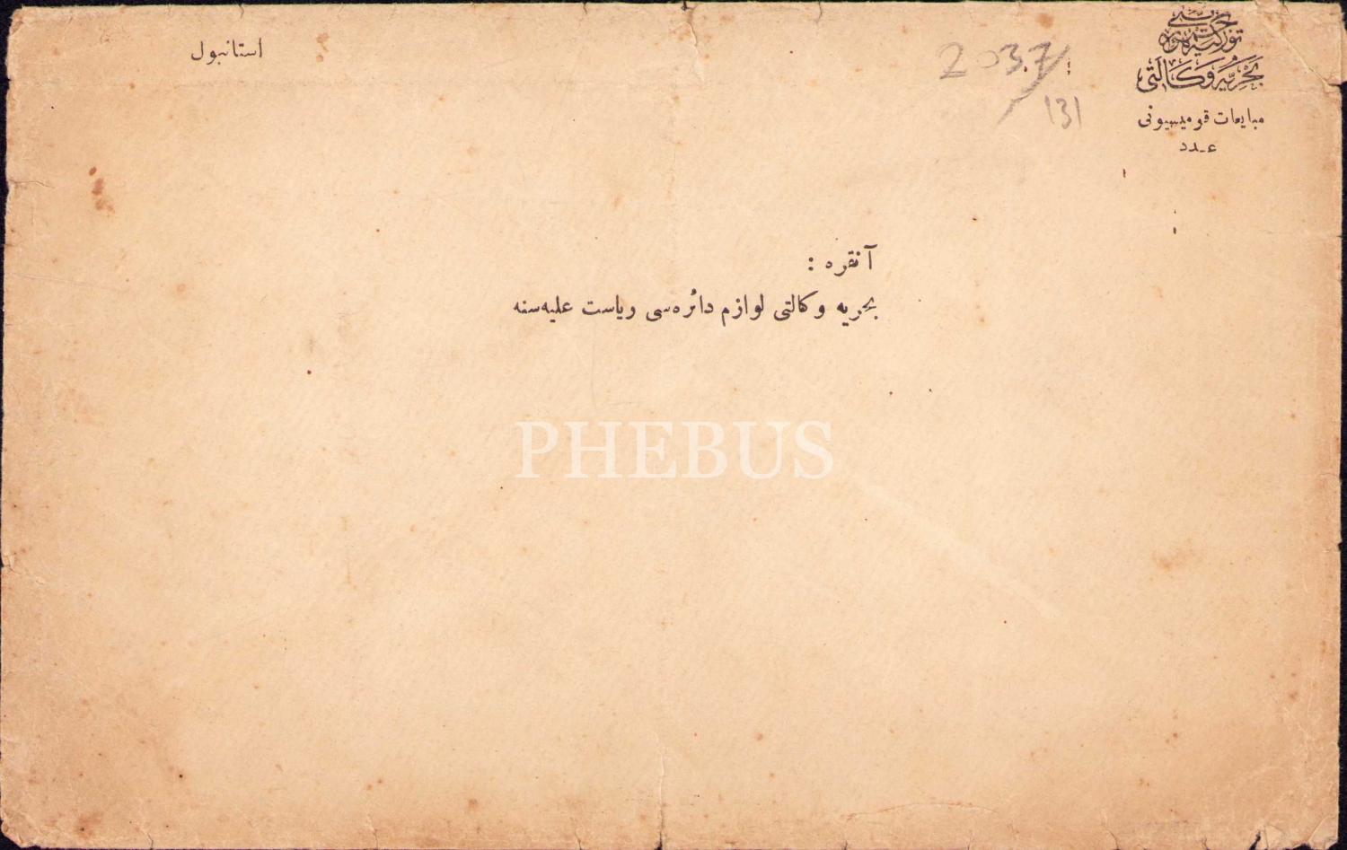 Ankara Bahriye Vekaleti Levazım Dairesi Başkanlığı'na gönderilen Osmanlıca yazılı zarf, 14x22 cm, epey yıpranmış haliyle