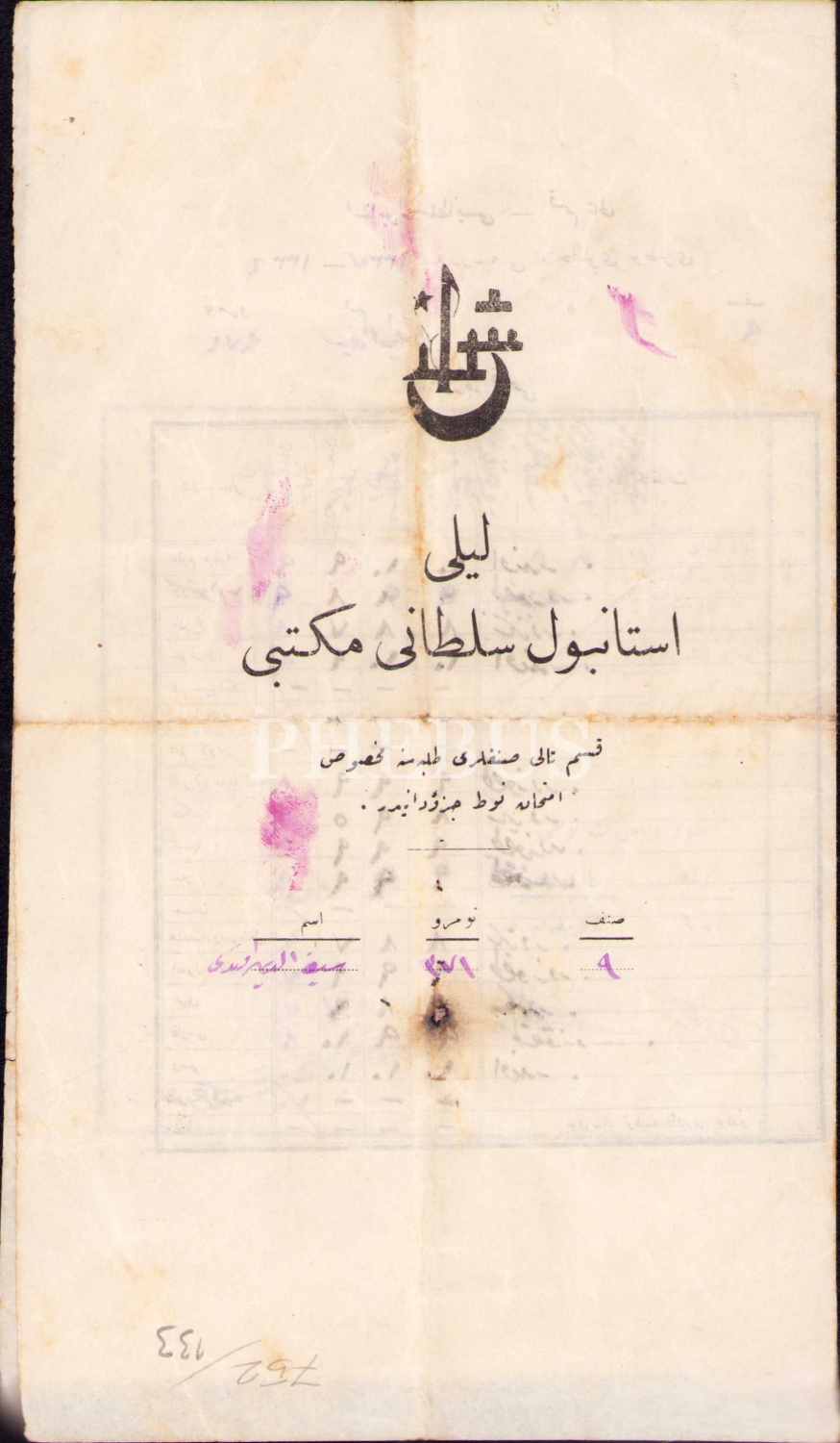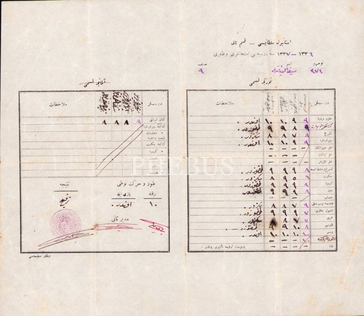 Osmanlıca İstanbul Sultanisi sınav sonuçları belgesi, 1336-37 eğitim senesine ait, 24x27 cm, hafif yıpranmış haliyle