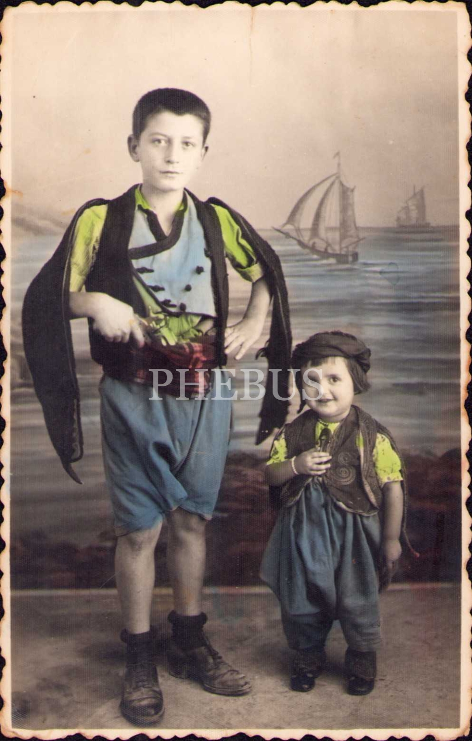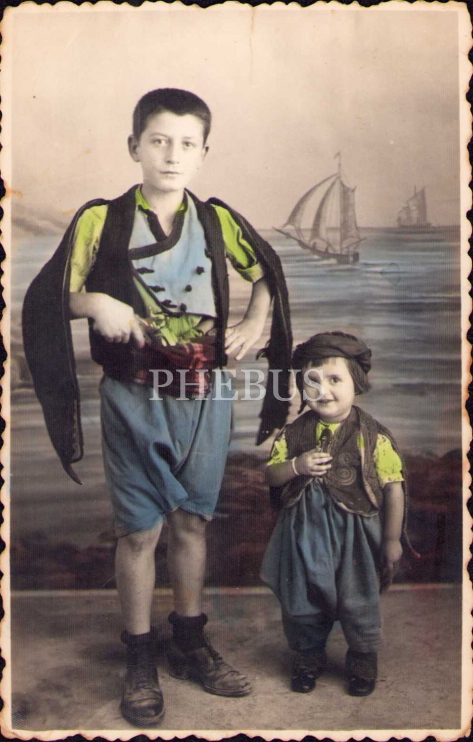 Yöresel kıyafetli iki erkek çocuğunun elle renklendirilmiş hatıra fotoğrafı, Uşak 1937, hafif yıpranmış haliyle