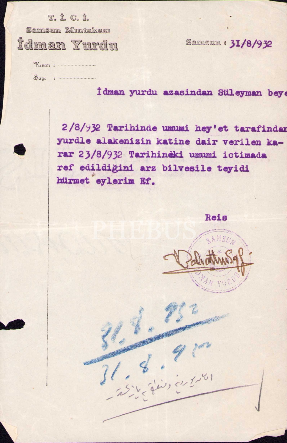 T.İ.C.İ. Samsun Mıntakası İdman Yurdu antetli üye bilgilendirme mektubu, 1932 tarihli, 13x21 cm, hafif yıpranmış haliyle