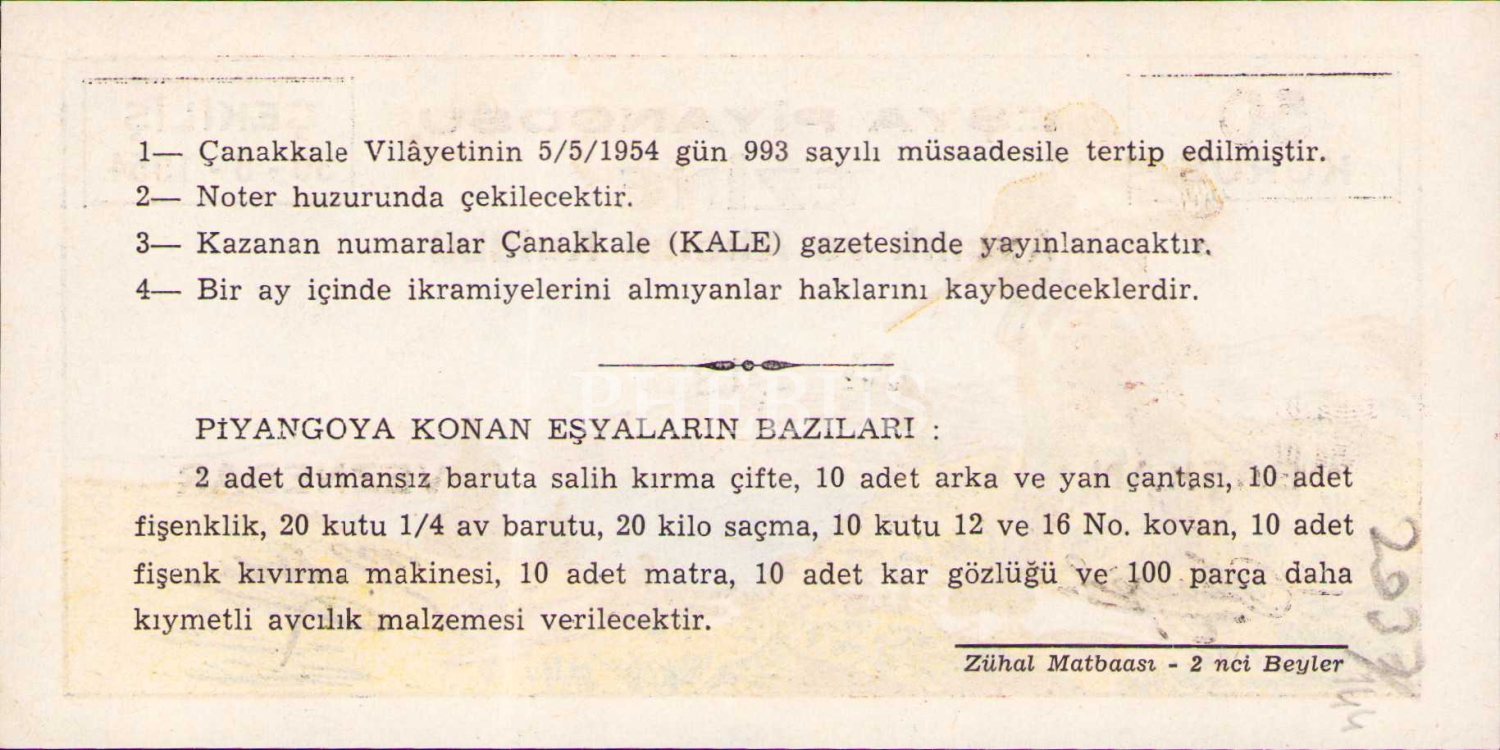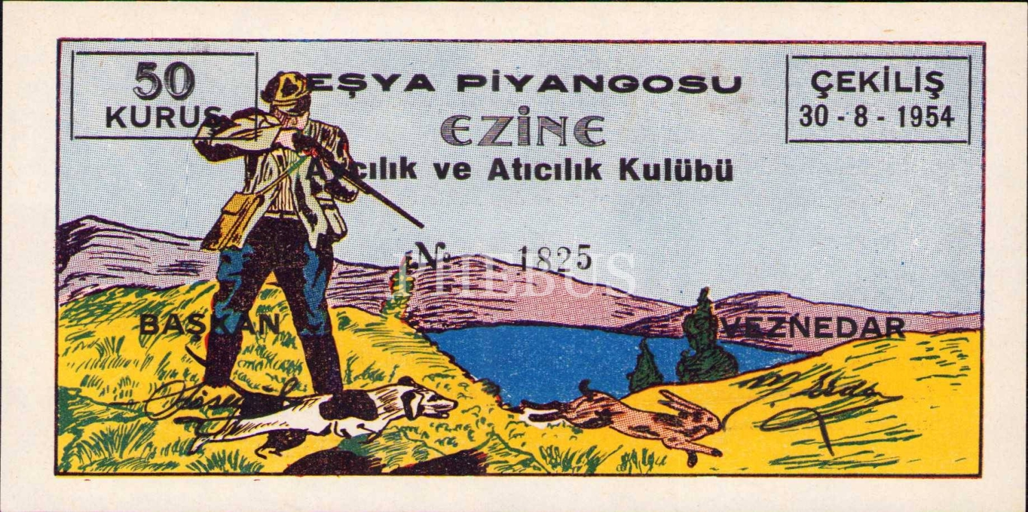Ezine Avcılık ve Atıcılık Kulübü eşya piyangosu, 1954 tarihli, 8x15 cm