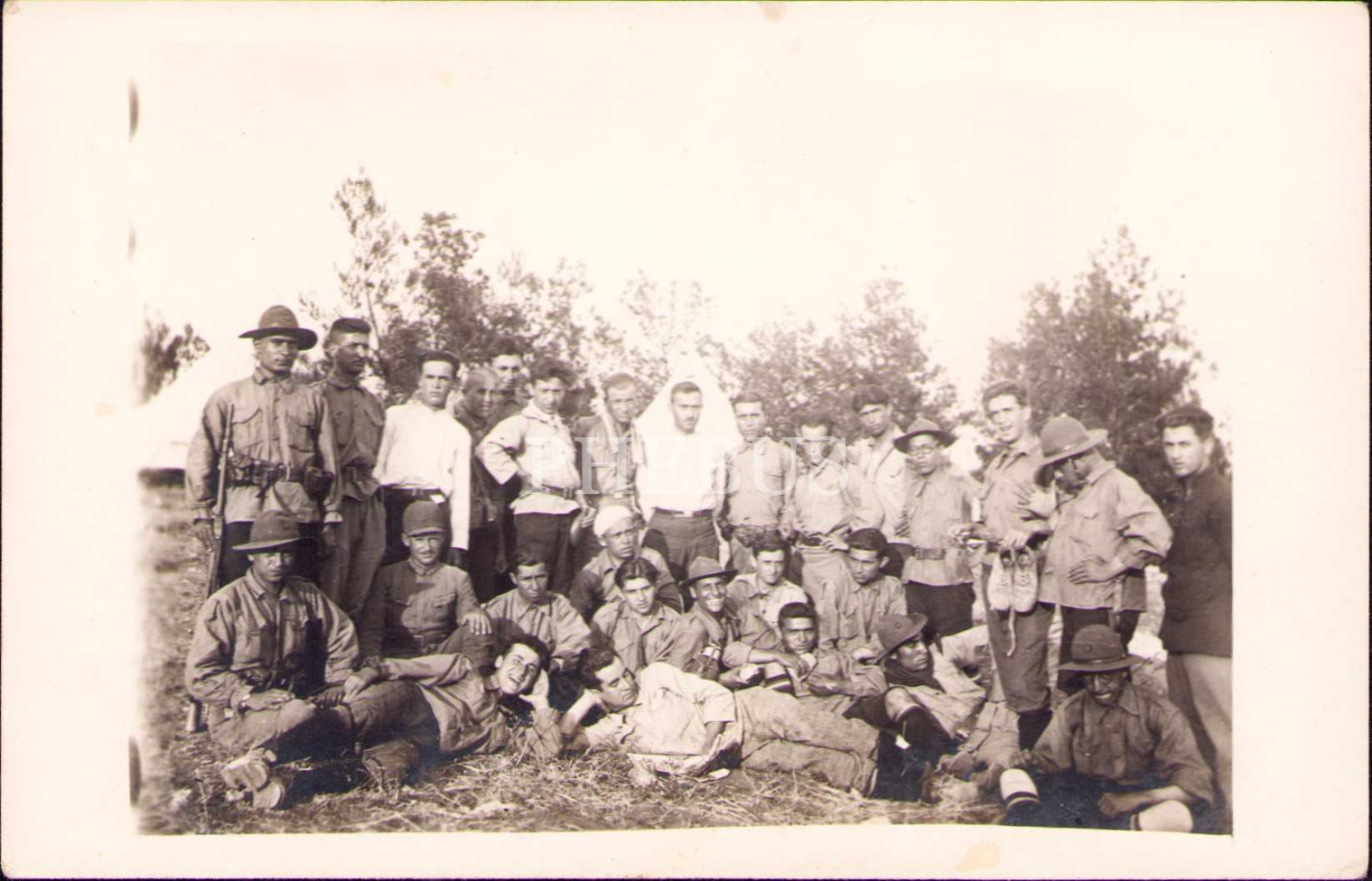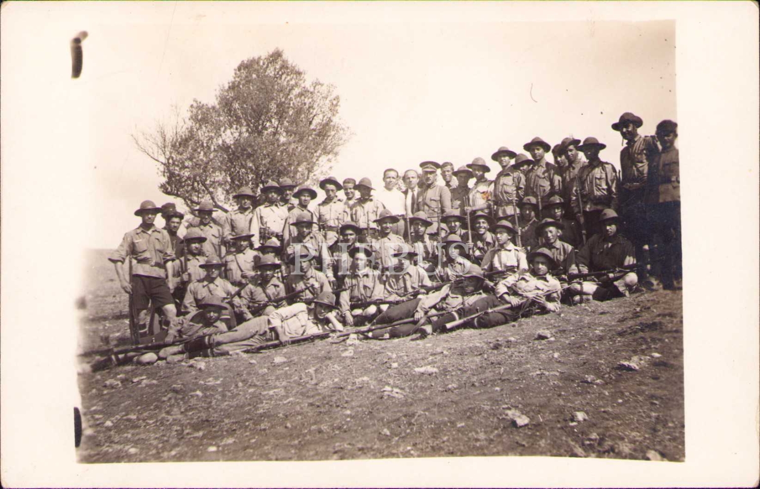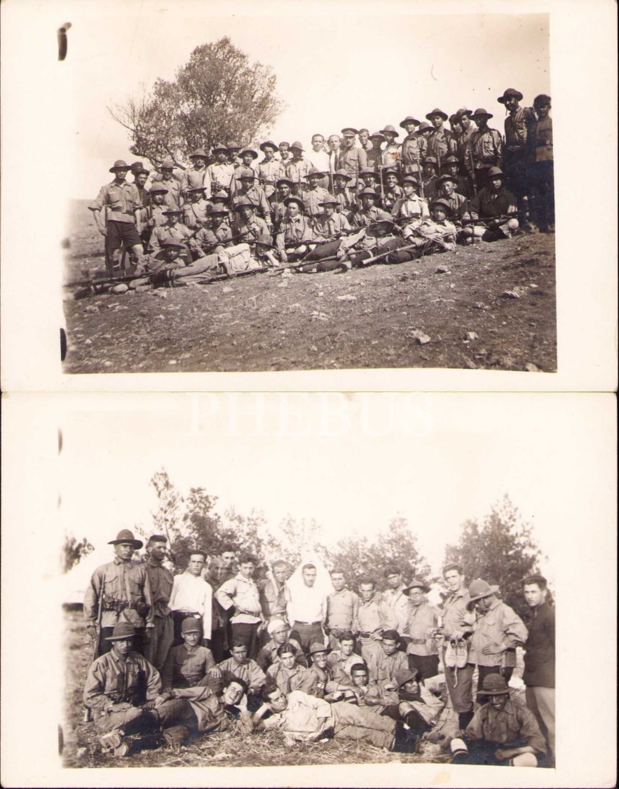 İki adet tüfekli topluluk hatıra fotoğrafı, köşeleri hafif soyulmuş haliyle