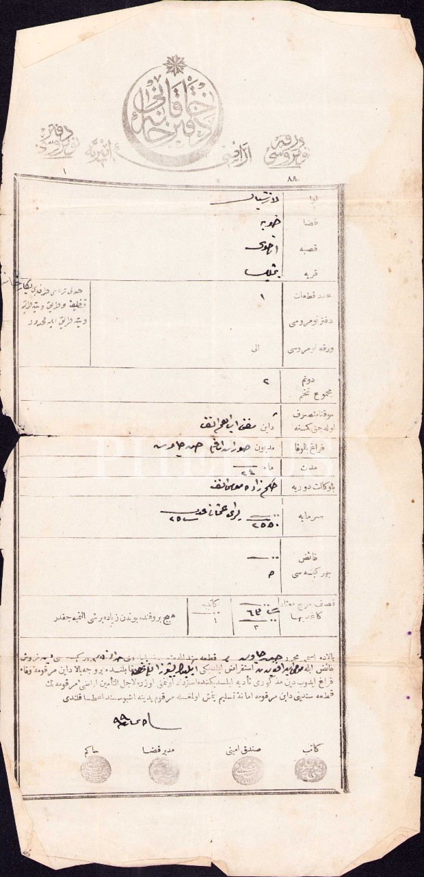 Osmanlıca Defterhane-i Hakani antetli arz-ı mirî tarla tapusu, Hopa/Lazistan 1299, 19x40 cm, yıpranmış haliyle