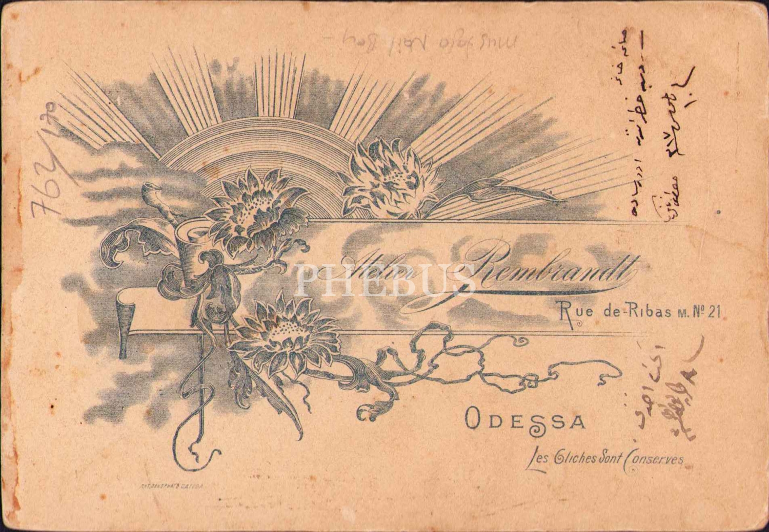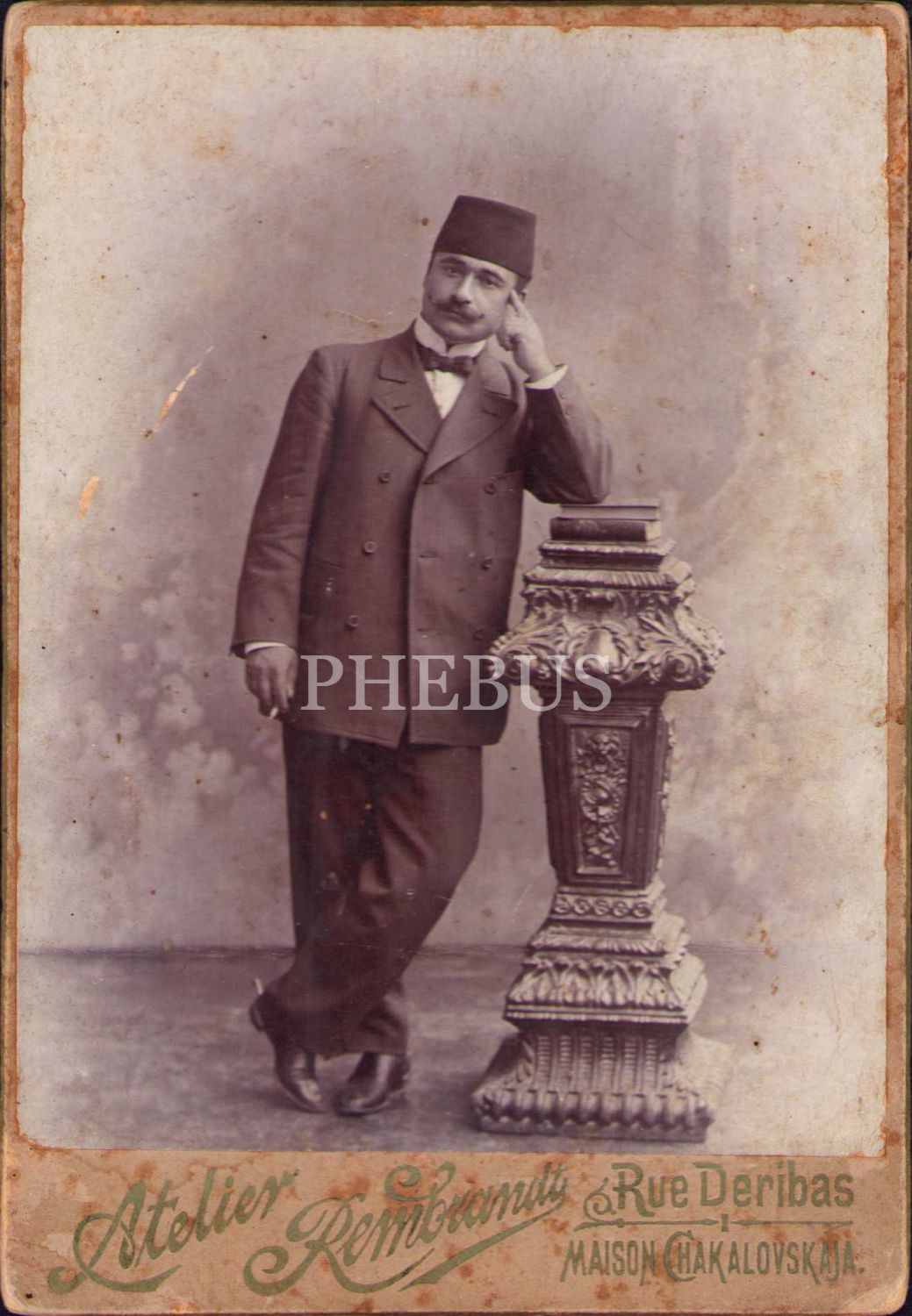 Elinde sigarası ve kitaplar ile poz veren fesli beyefendi, Atelier Rembrandt-Maison Chakalovskaja, 1317 tarihli Osmanlıca ithaf yazısıyla, 11x14 cm, yıpranmış haliyle