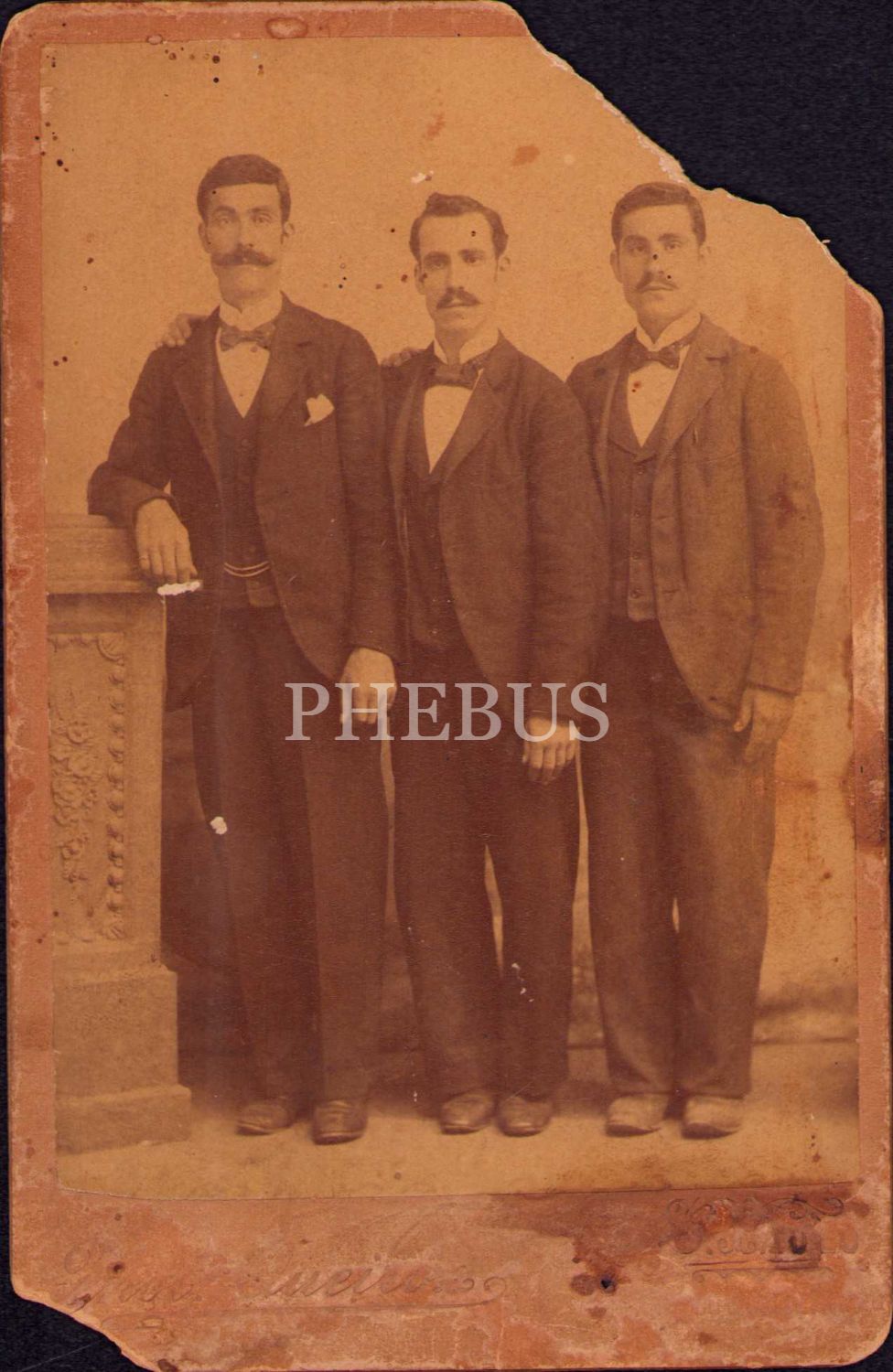 Üç beyefendinin hatıra fotoğrafı, S. Paulo damgalı, arkası yazılı, 10x16 cm, epey yıpranmış haliyle
