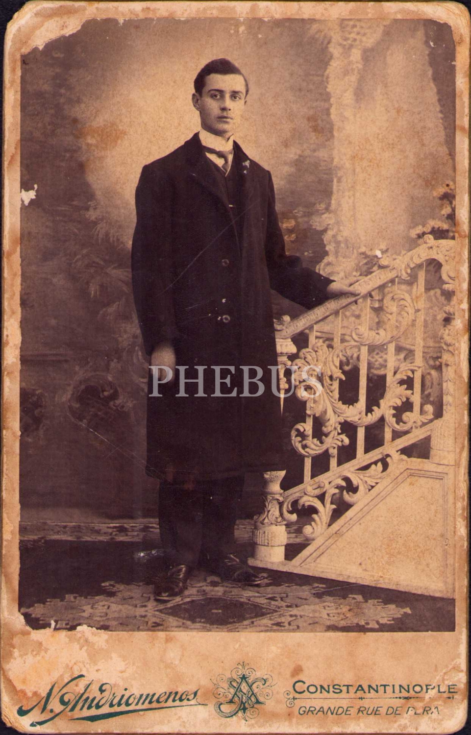 Şık giyimli genç beyefendi, N. Andriomenos Fotoğrafhanesi/Constantinople, 10x16 cm, yıpranmış haliyle