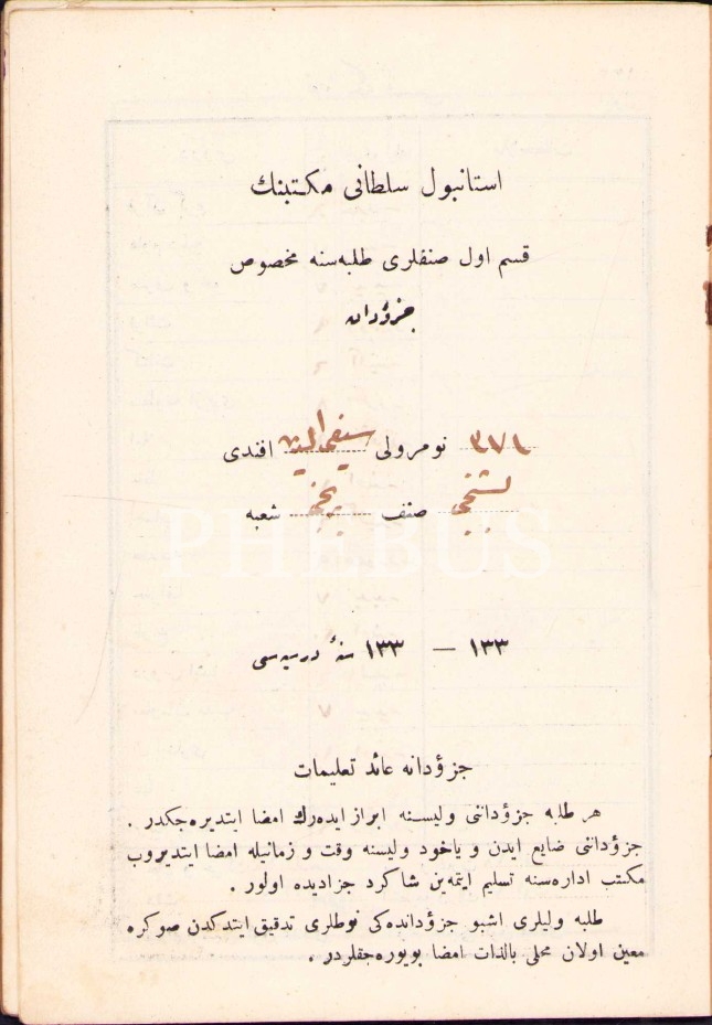 Osmanlıca İstanbul Sultani Mektebi öğrenci karnesi, 1332-33 eğitim senesine ait, 12x16 cm, bazı sayfaları ayrık haliyle