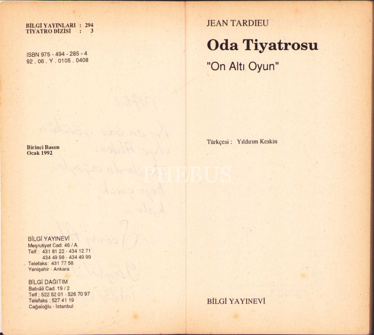 Oda Tiyatrosu "On Altı Oyun" [1. baskı], Jean Tardieu, çev. Yıldırım Keskin, Bilgi Yayınevi, Ankara 1992, 151 s., 11x18 cm