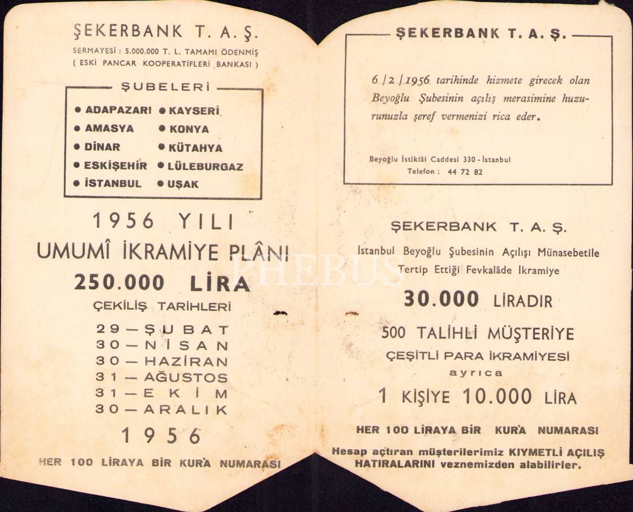 Şekerbank, 1956 Beyoğlu şubesinin açılış davetiyesi ve reklam kartı, 17x21 cm
