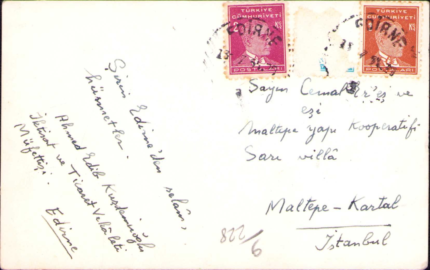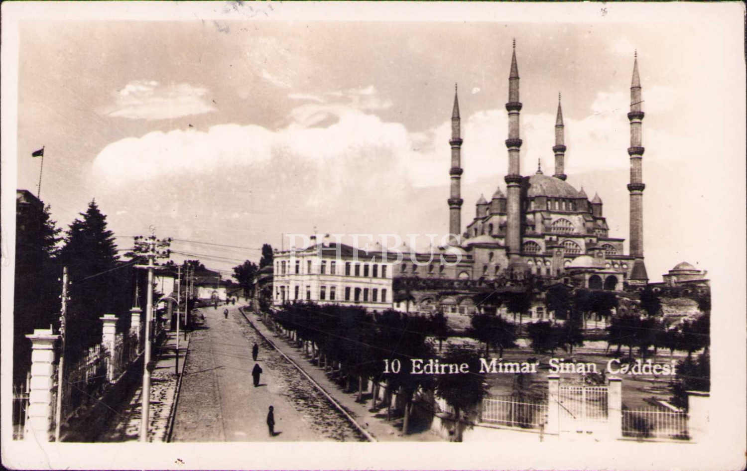 Edirne Mimar Sinan Caddesi, arkası yazılı ve postadan geçmiş, hafif yıpranmış haliyle