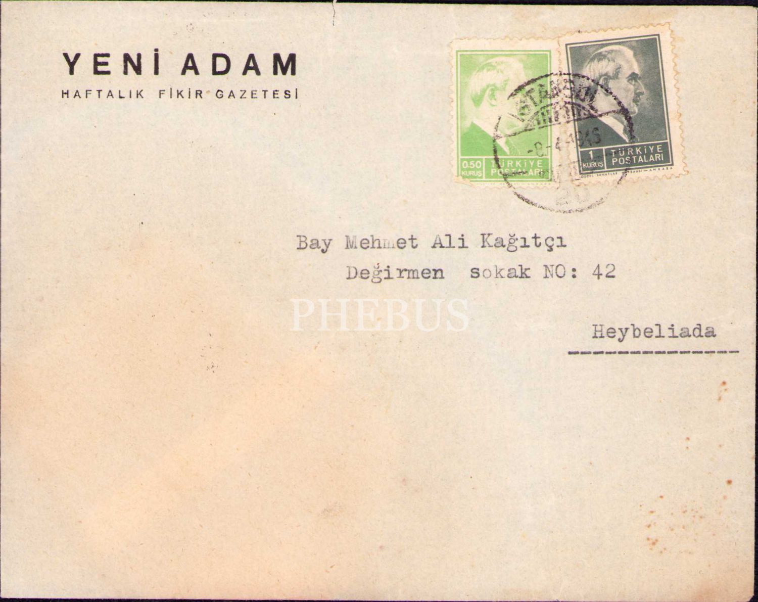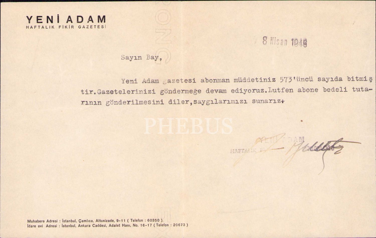Yeni Adam Haftalık Fikir Gazetesi'nden Mehmet Ali Kâğıtçı'ya abonman ücreti ödeme bildirisi ve zarfı, 12x15 cm, yıpranmış haliyle