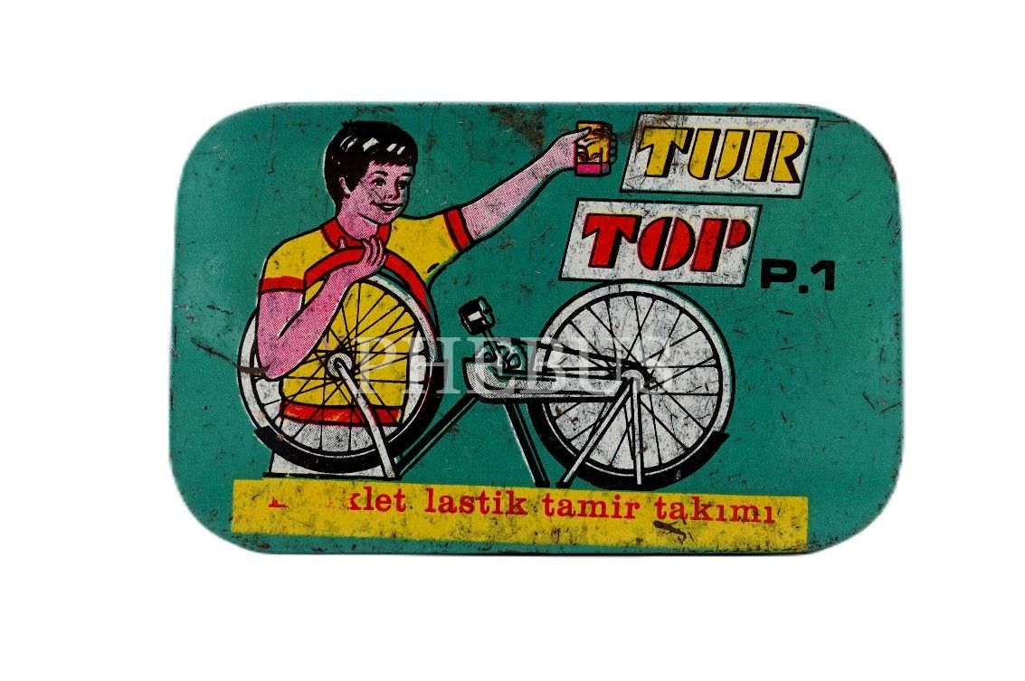 Teneke kutuda Tur Top marka bisiklet lastiği tamir takımı, 1.5x5.8 cm