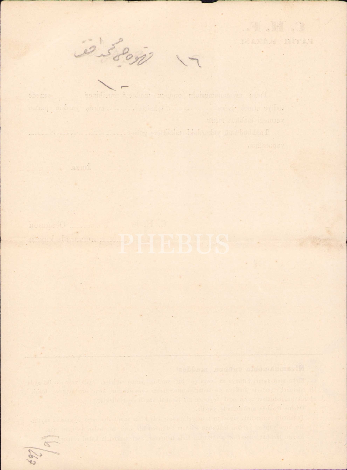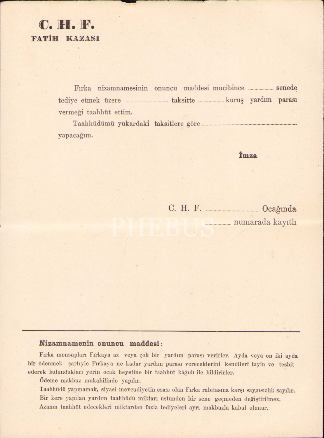 C.H.F. Fatih Kazası [boş] yardım taahhüt belgesi, 17x22 cm, üst kenarı yıpranmış haliyle