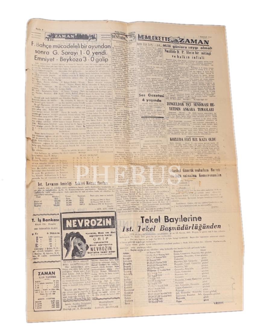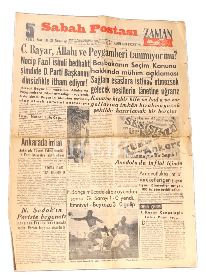 Sabah Postası-Zaman gazetesi, 7 Kasım 1949, "C. [Celal] Bayar Allahı ve Peygamberi tanımıyor mu?" başlıklı manşet haberiyle, 4 sayfa, 40x57 cm, hafif yıpranmış haliyle