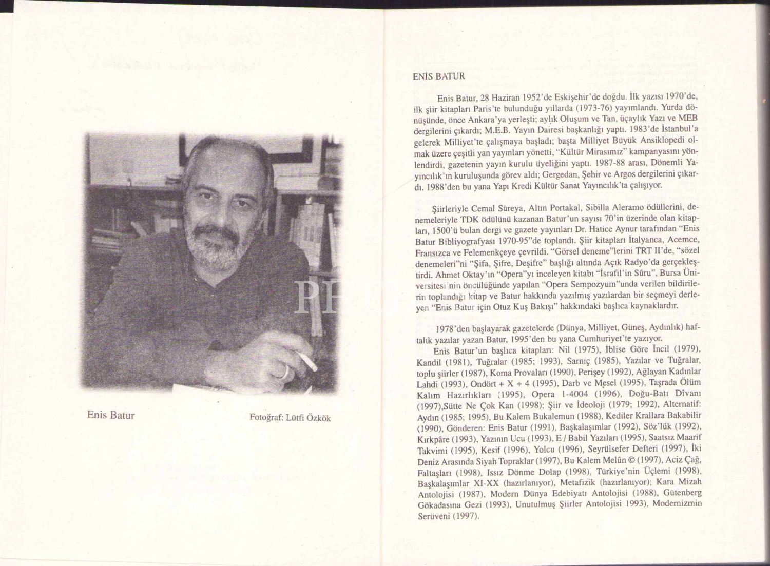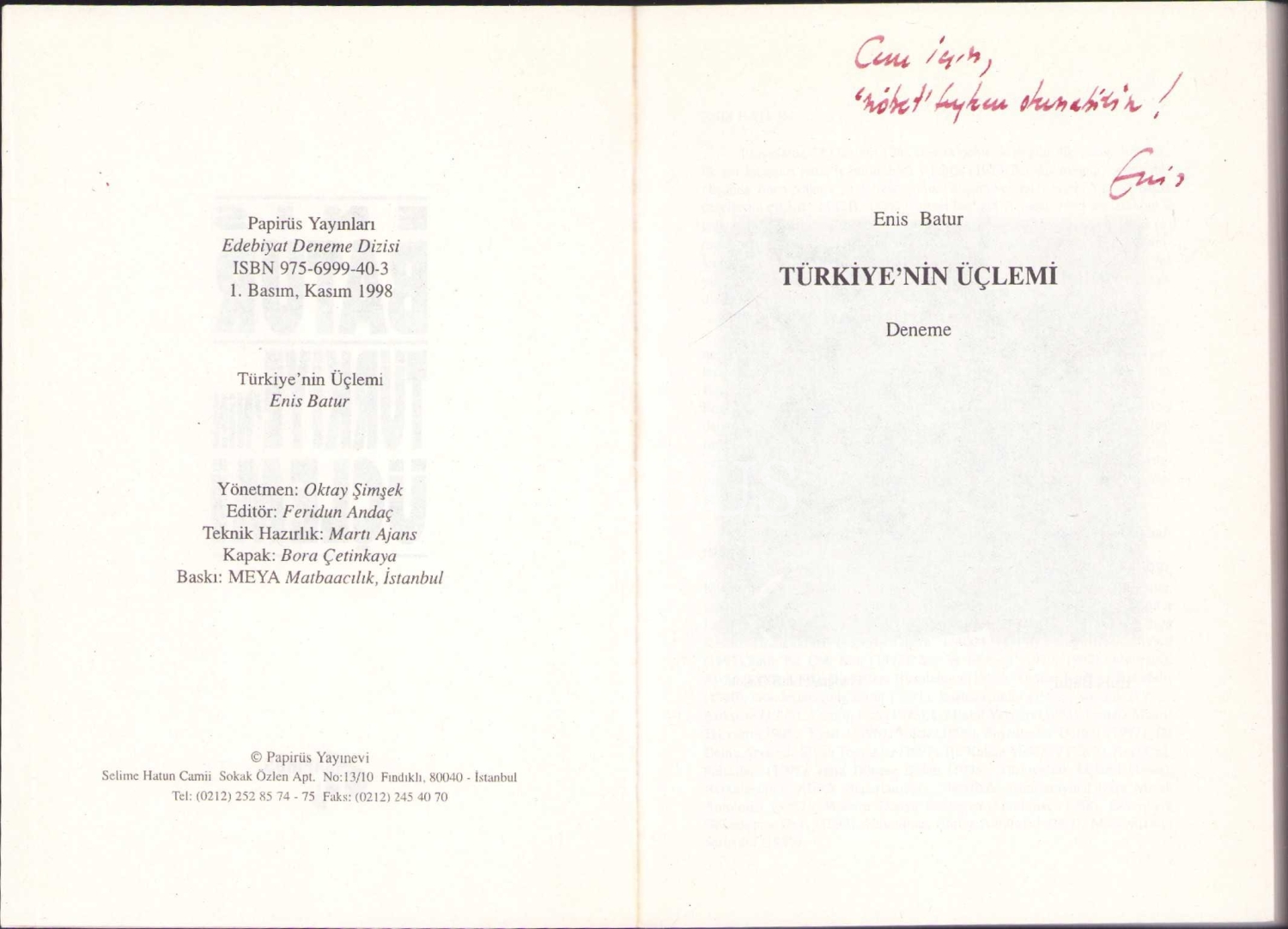 Türkiye'nin Üçlemi [1. baskı], Enis Batur, yazarından ithaf ve imzalı, Papirüs Yayınevi, İstanbul 1998, 271 s., 13x19 cm