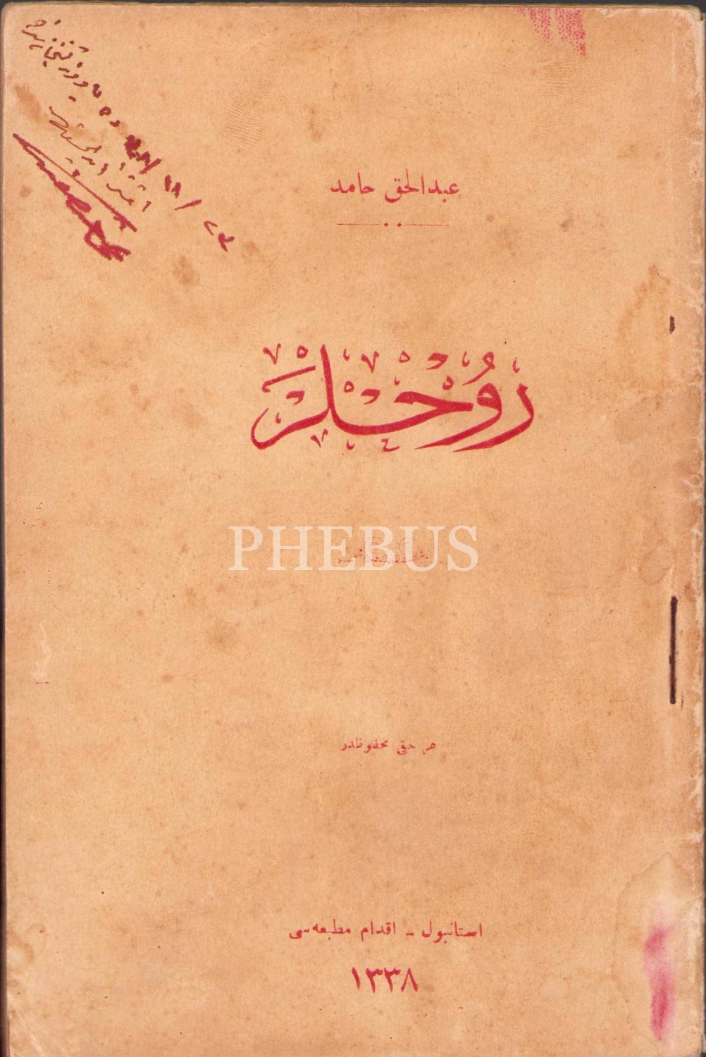 Osmanlıca Ruhlar, Abdülhak Hamid [Tarhan], ithaflı ve imzalı, İkdam Matbaası, İstanbul 1338, 67 s., 12x18 cm, kapağı su almış ve hafif yıpranmış haliyle