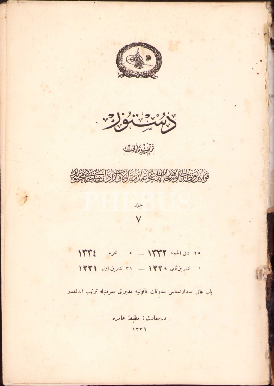 Osmanlıca Destûr-7. Cild, Amire Matbaası, Dersaadet [İstanbul] 1336, 832 s., 17x24 cm, cildi ayrık ve yıpranmış haliyle