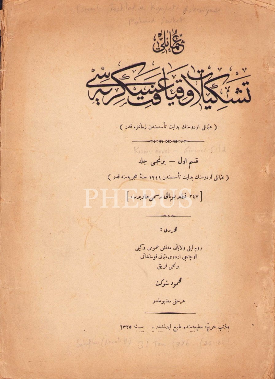 Osmanlıca Osmanlı Teşkîlât ve Kıyâfet-i Askeriyyesi-1. Cild 1. Kısım, Mahmud Şevket, Mekteb-i Harbiyye Matbaası, 1325, 92 s., 21x29 cm, ciltsiz ve sayfaları dağınık haliyle