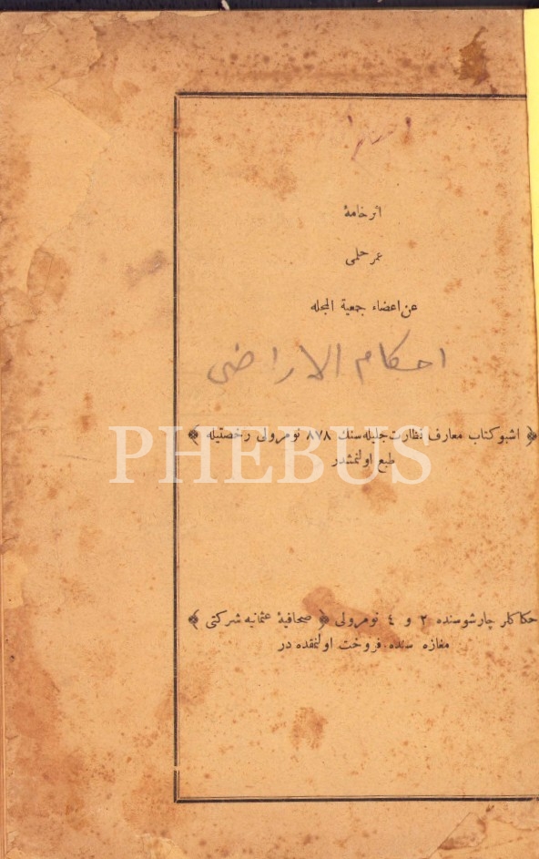 Osmanlıca Ahkâmu'l-Arâzî, Ömer Hilmi, Sahafiye-i Osmaniye Şirketi, 77 s., 16x24 cm, künye sayfası yırtık haliyle