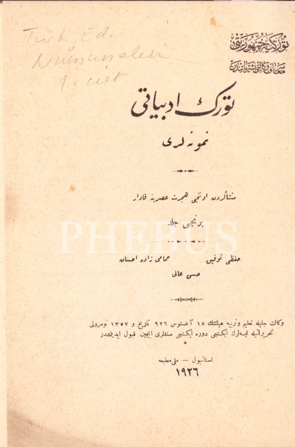 Osmanlıca Türk Edebiyyâtı Numûneleri-1. Cild, Hıfzı Tevfik-Hamamizade İhsan-Hasan Âli, Millî Matbaa, İstanbul 1926, 400 s., 17x24 cm