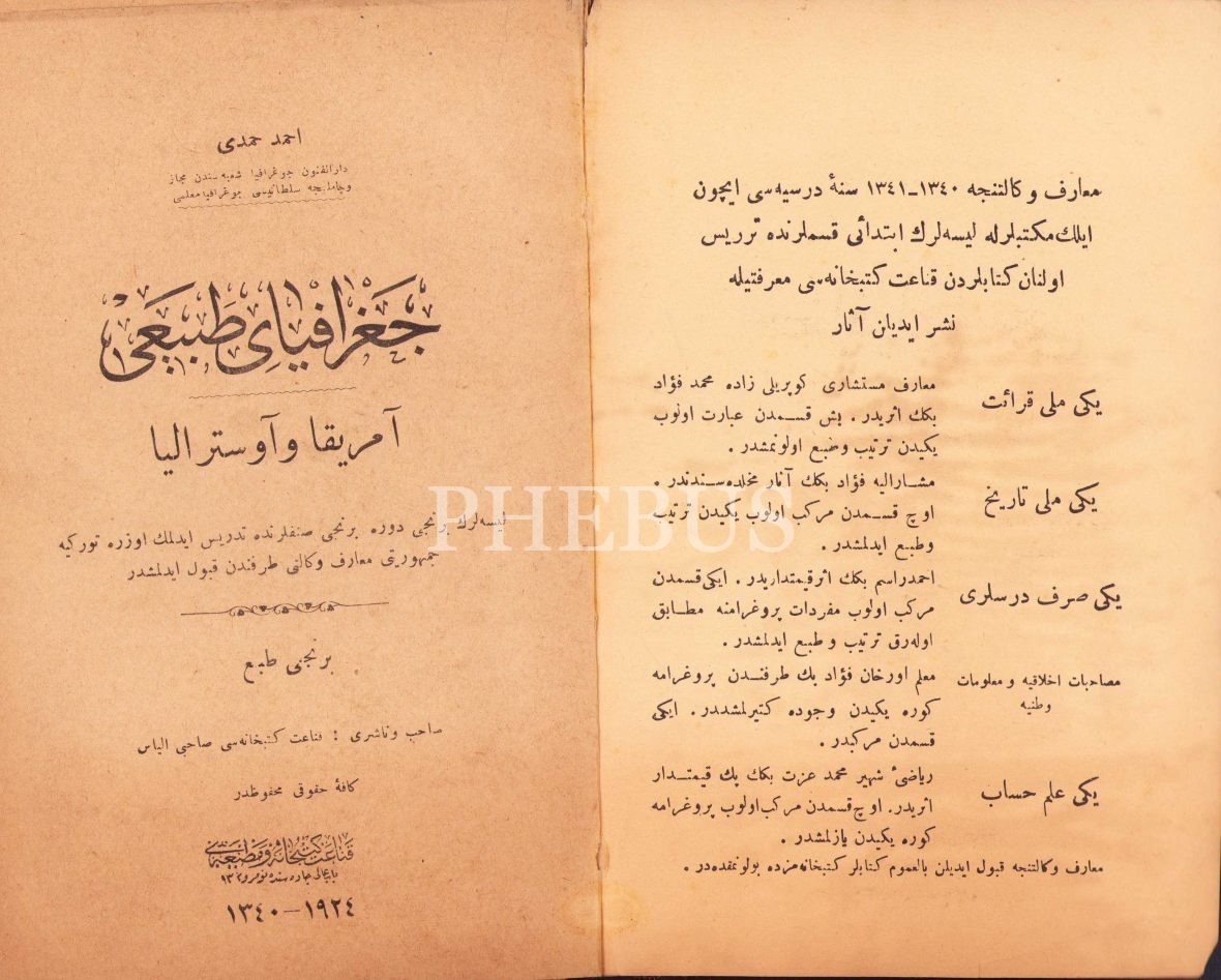 Osmanlıca Coğrafya-yı Tabîî (Amerika ve Avustralya) [1. baskı], Ahmed Hamdi, Kanaat Matbaası, İstanbul 1924, 143 s., 14x21 cm, kapak sayfası yıpranmış haliyle