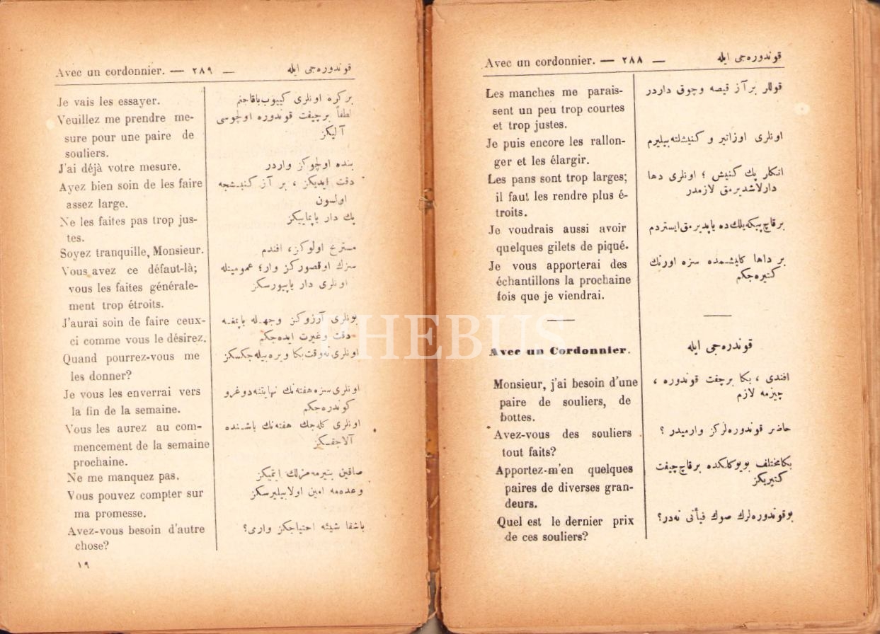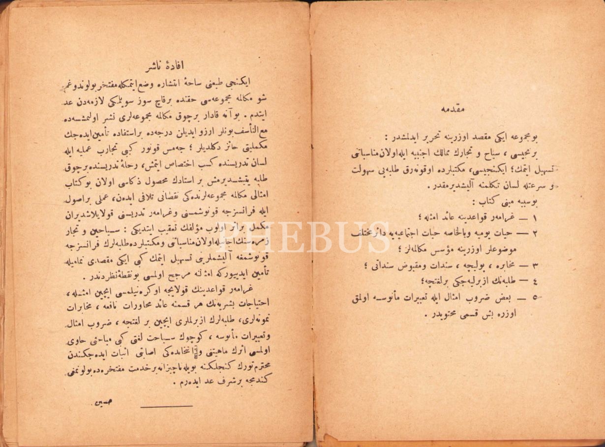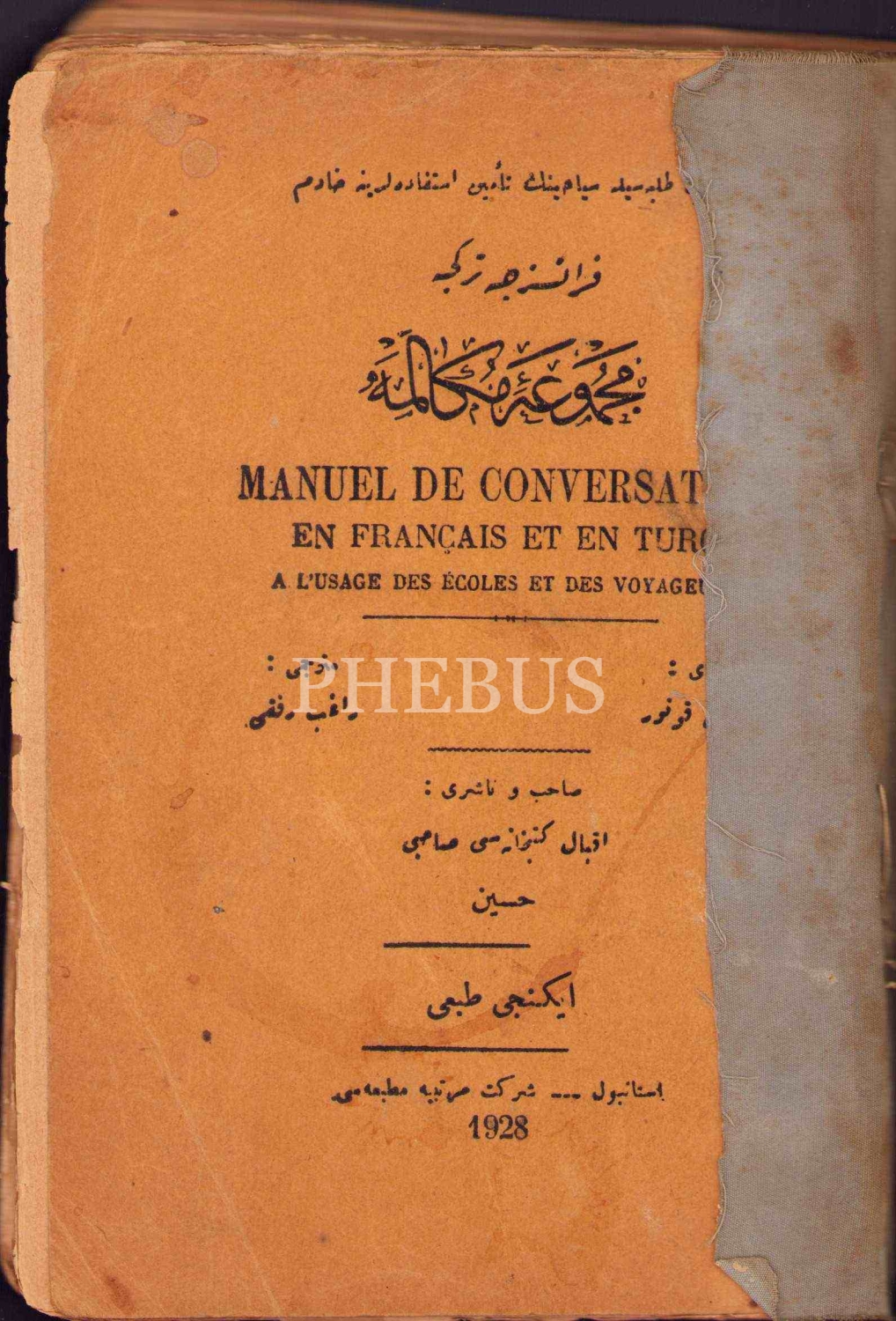 Fransızca-Türkçe [Osmanlıca] Mecmûa-i Mükâleme [Konuşma], James Connor, çev. Ragıb Rıfkı, Şirket-i Mürettibiye Matbaası, İstanbul 1928, 480 s., 13x19 cm, kapağı yıpranmış haliyle