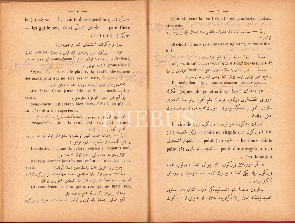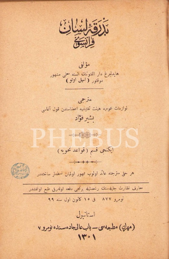 Osmanlıca Bedraka-i Lisân-ı Fransevî, Emil Otto, çev. Beşir Fuad, Mihran Matbaası, İstanbul 1301, 343 s., 14x19 cm, bir sayfası yırtık haliyle