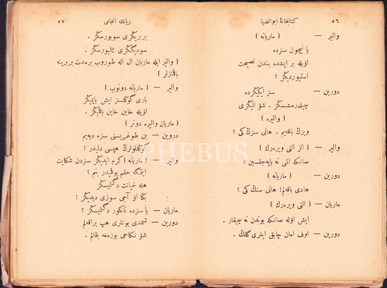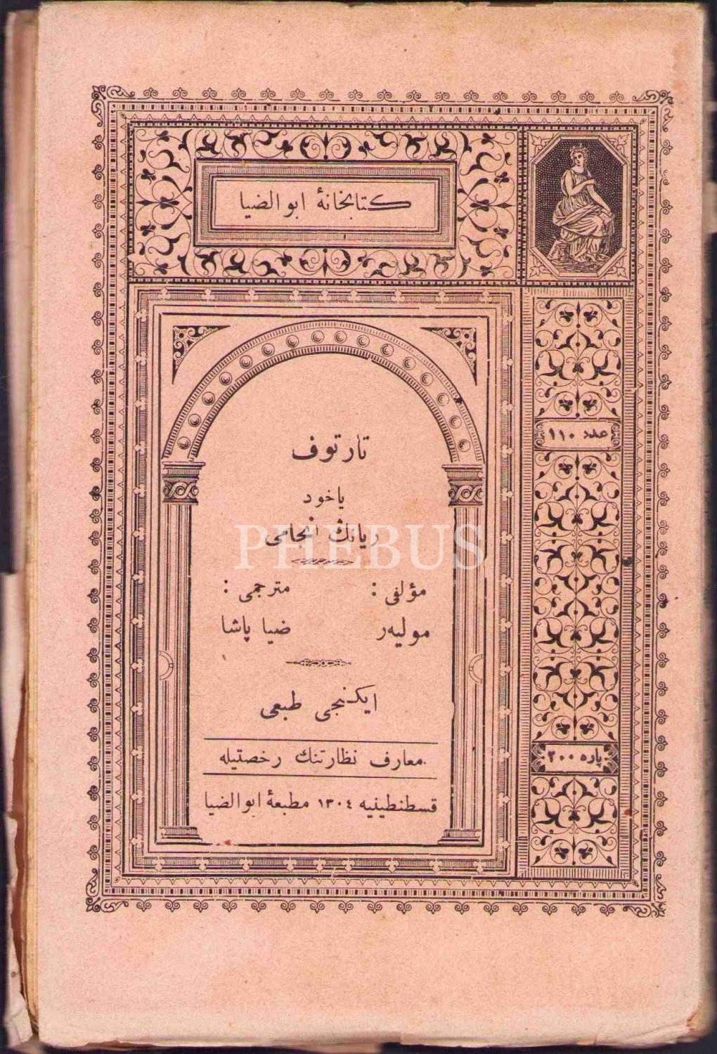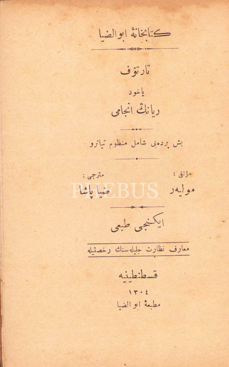 Osmanlıca Tartuffe Yâhûd Riyânın Encâmı, Moliere , çev. Ziya Paşa, Ebuzziya Matbaası, Kostantiniyye 1304, 180 s., 10x16 cm, sayfaları açılmamış ve kapak sayfası yıpranmış haliyle