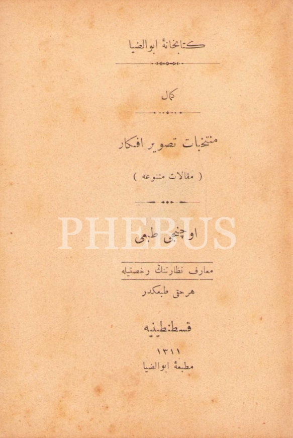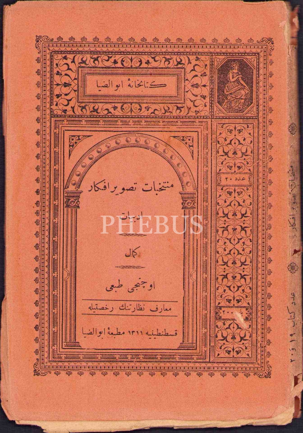 Osmanlıca Müntehabât-ı Tasvîr-i Efkâr [Çeşitli Makaleler], Kemal, Ebuzziya Matbaası, Kostantiniyye 1311, 128 s., 10x16 cm, sayfaları açılmamış ve kapak sayfası yıpranmış haliyle
