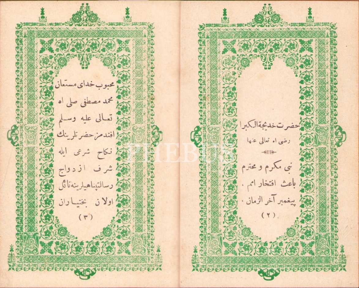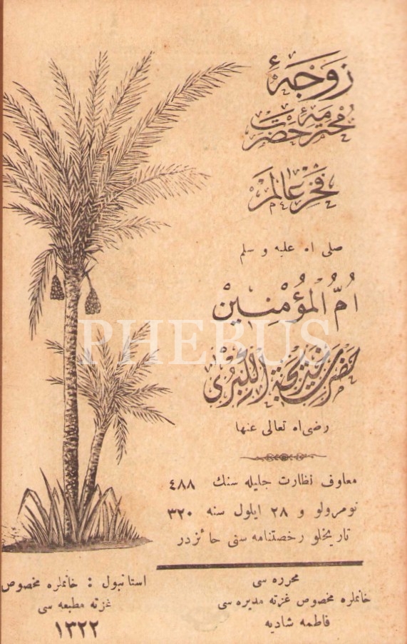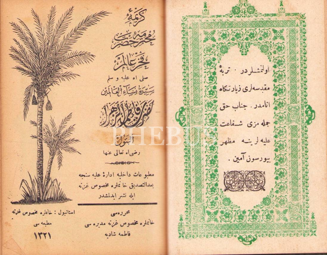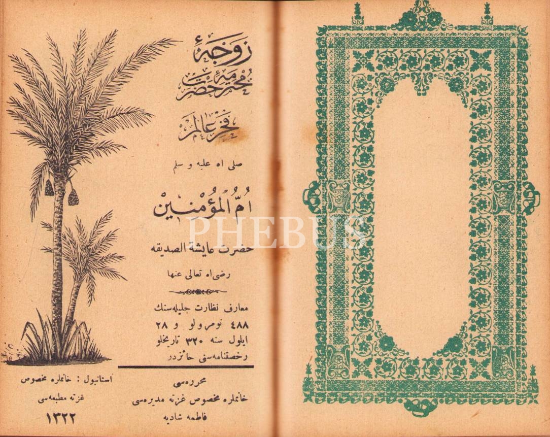 Kerime-i Muhtereme-i Hz. Fahr-i Âlem: Hz. Fatımatü'z-Zehra, 70 s.; Zevce-i Muhtereme-i Hz. Fahr-i Âlem: Hz. Aişe, 70 s.; Valide-i Muhtereme-i Fahr-i Âlem: Hz. Amine, 48 s.; Hanımlara Mahsus Gazete Matbaası, İstanbul 1321-22, 12x17 cm